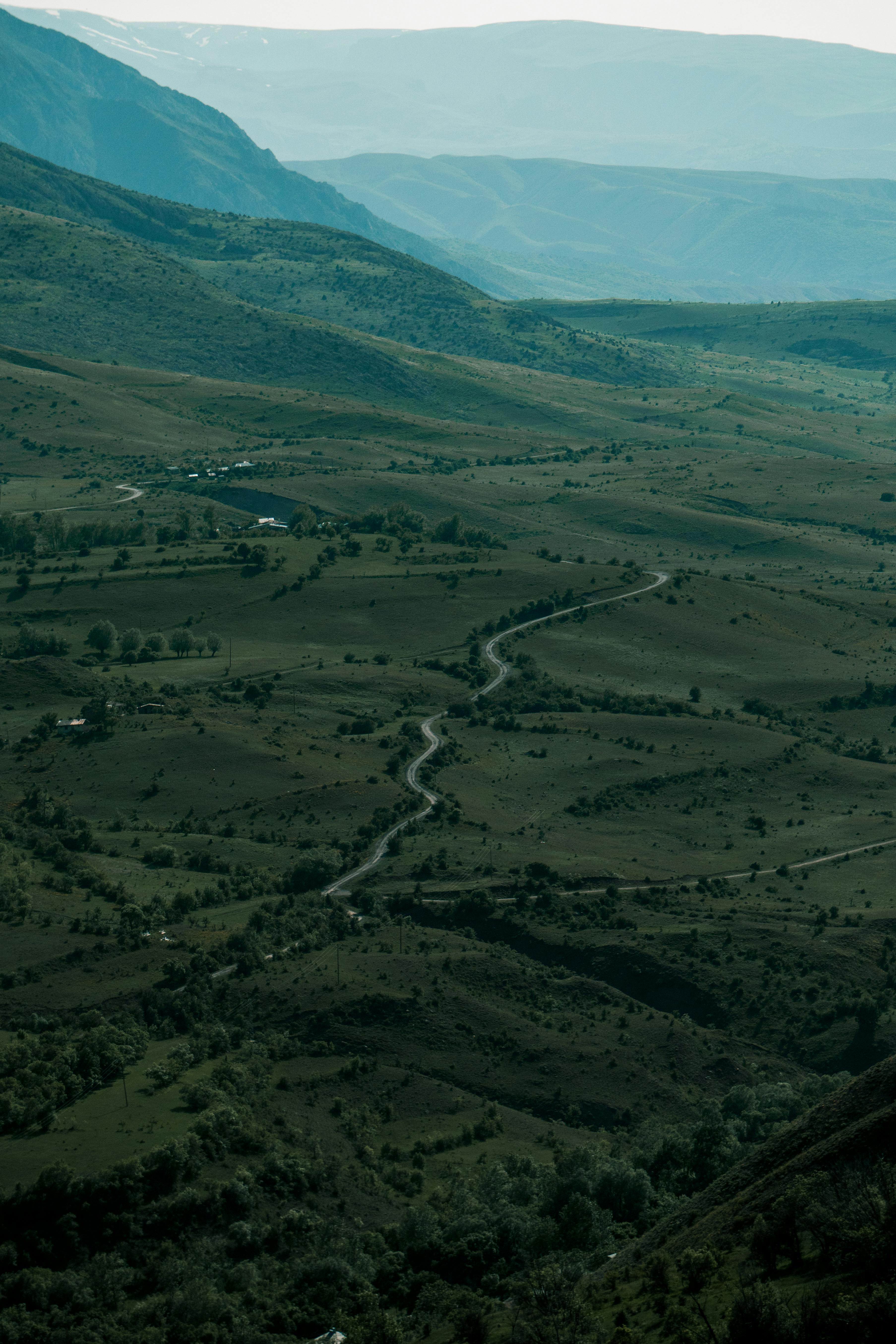 Aerial view of lush green hills and winding paths in Erzincan, showcasing nature's beauty.