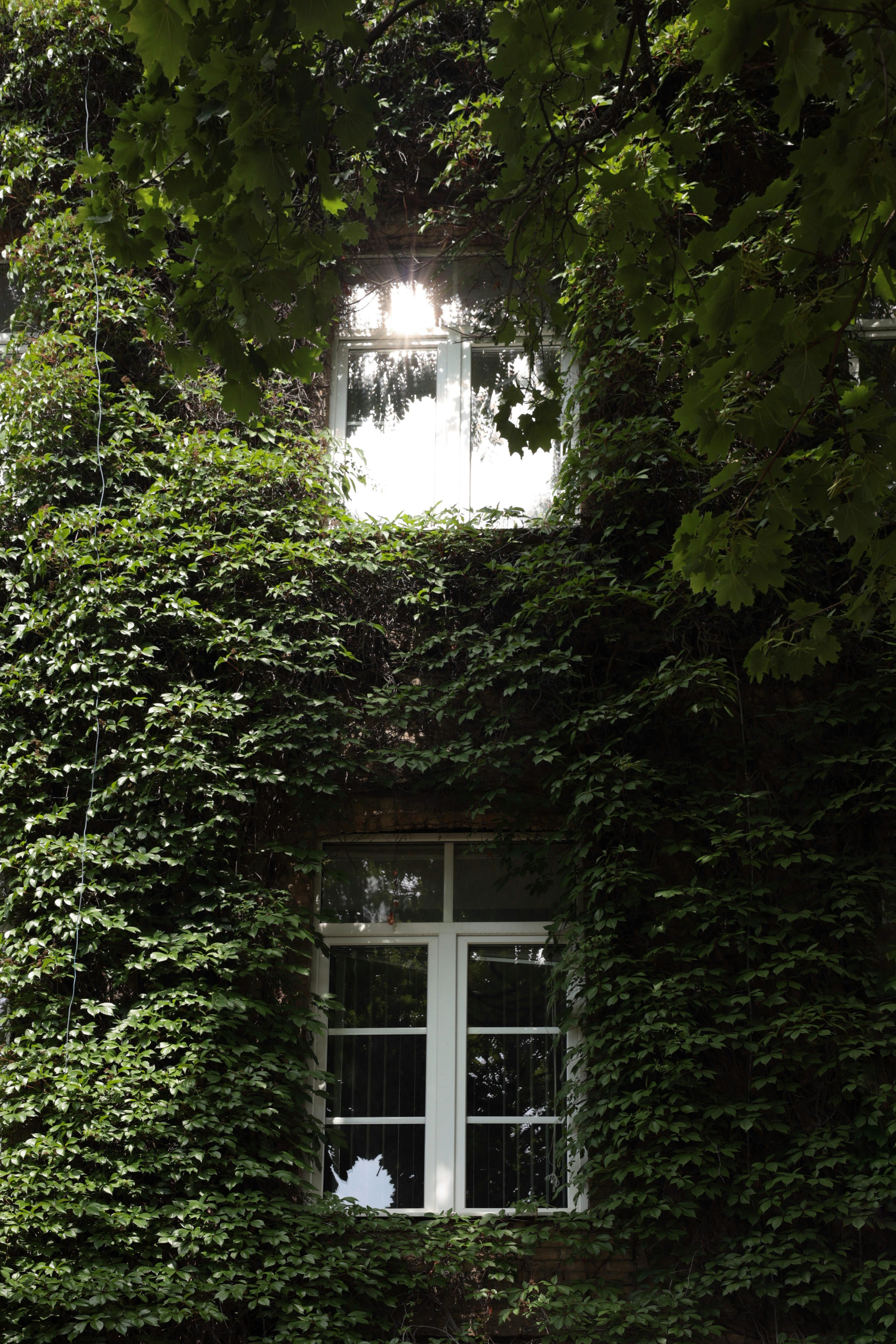 Sunlit window on ivy-covered building, creating a serene natural ambiance.