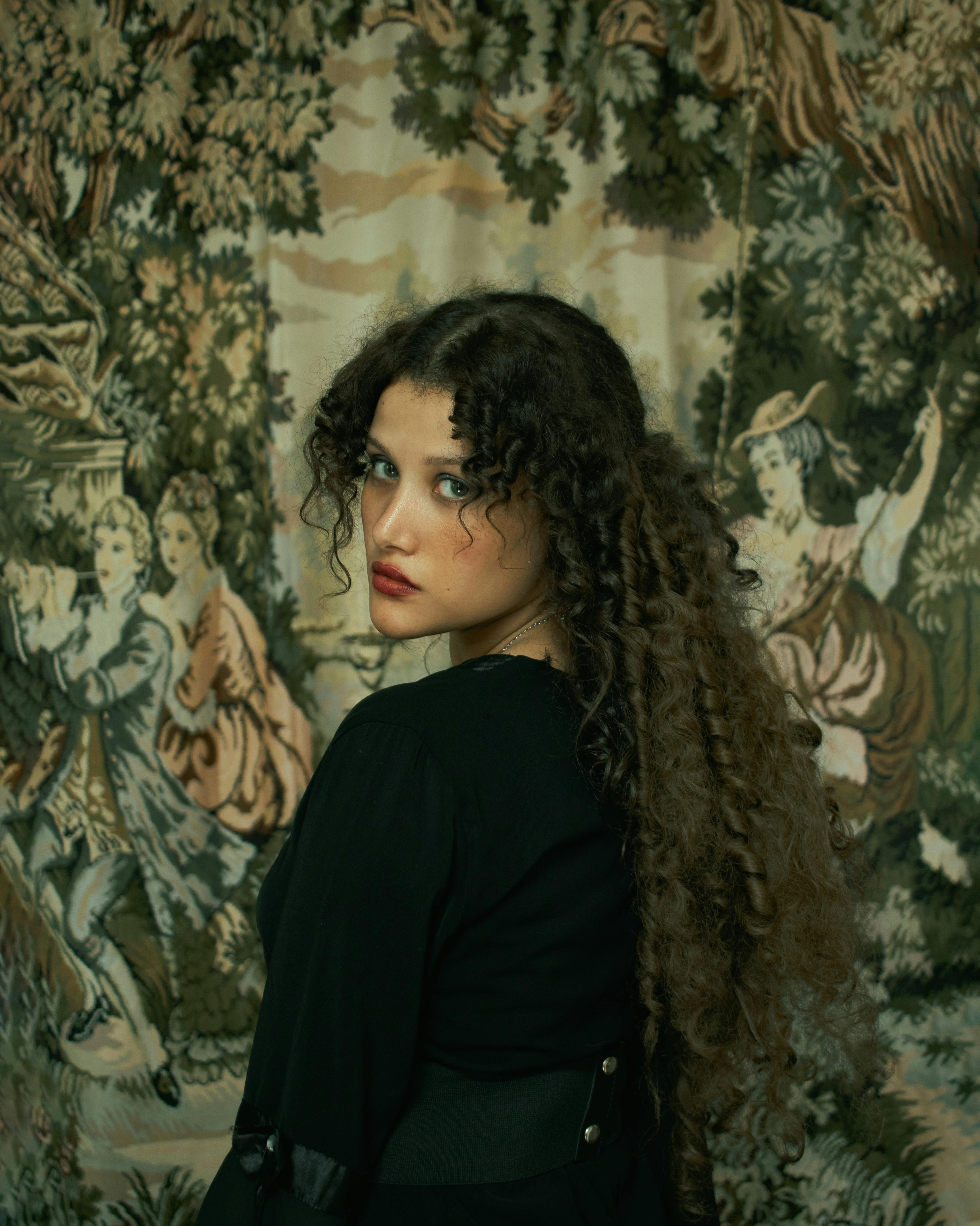 Elegant portrait of a woman with curly hair standing in front of a tapestry.