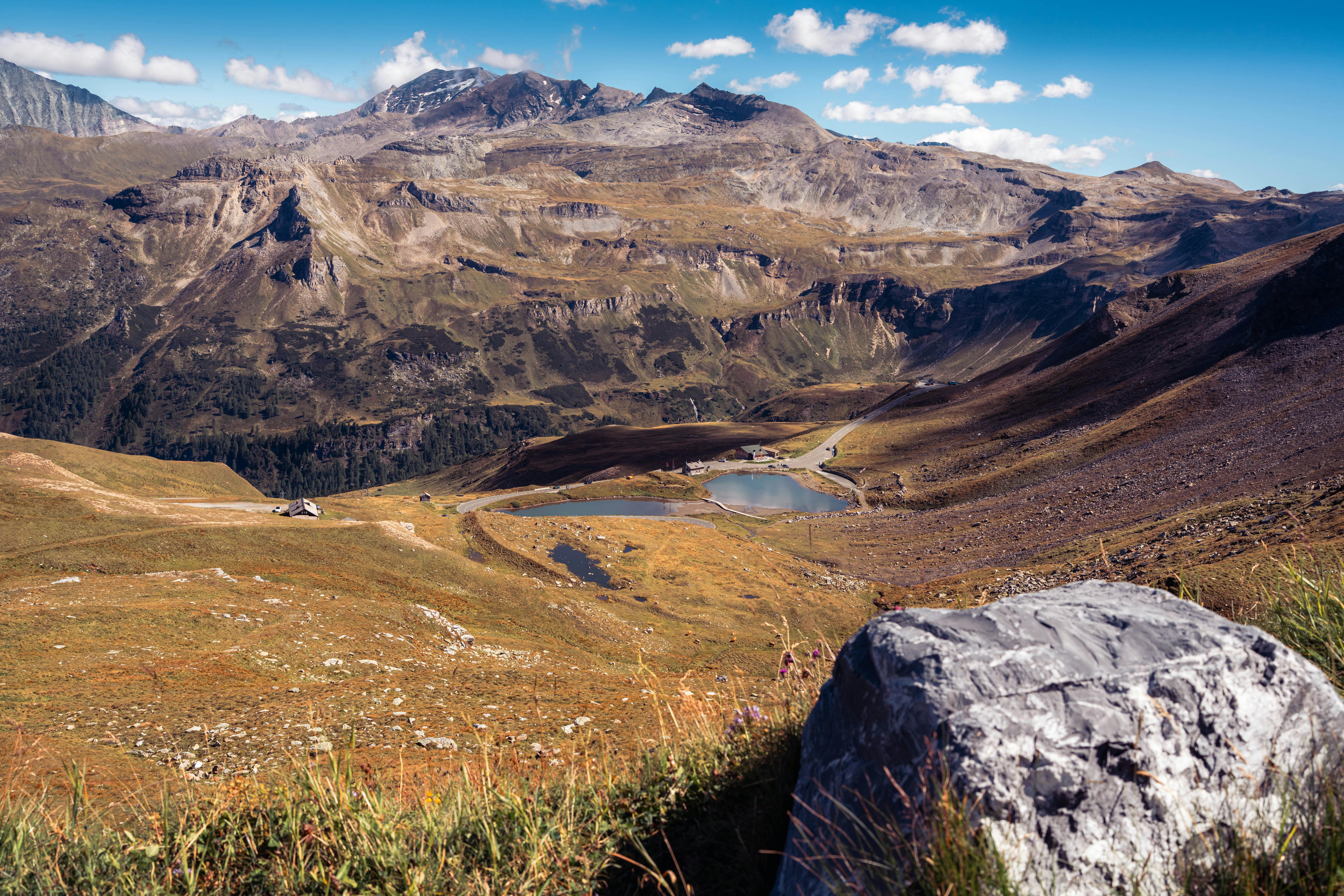Scenic view of a mountainous landscape with a serene blue lake under a clear sky.