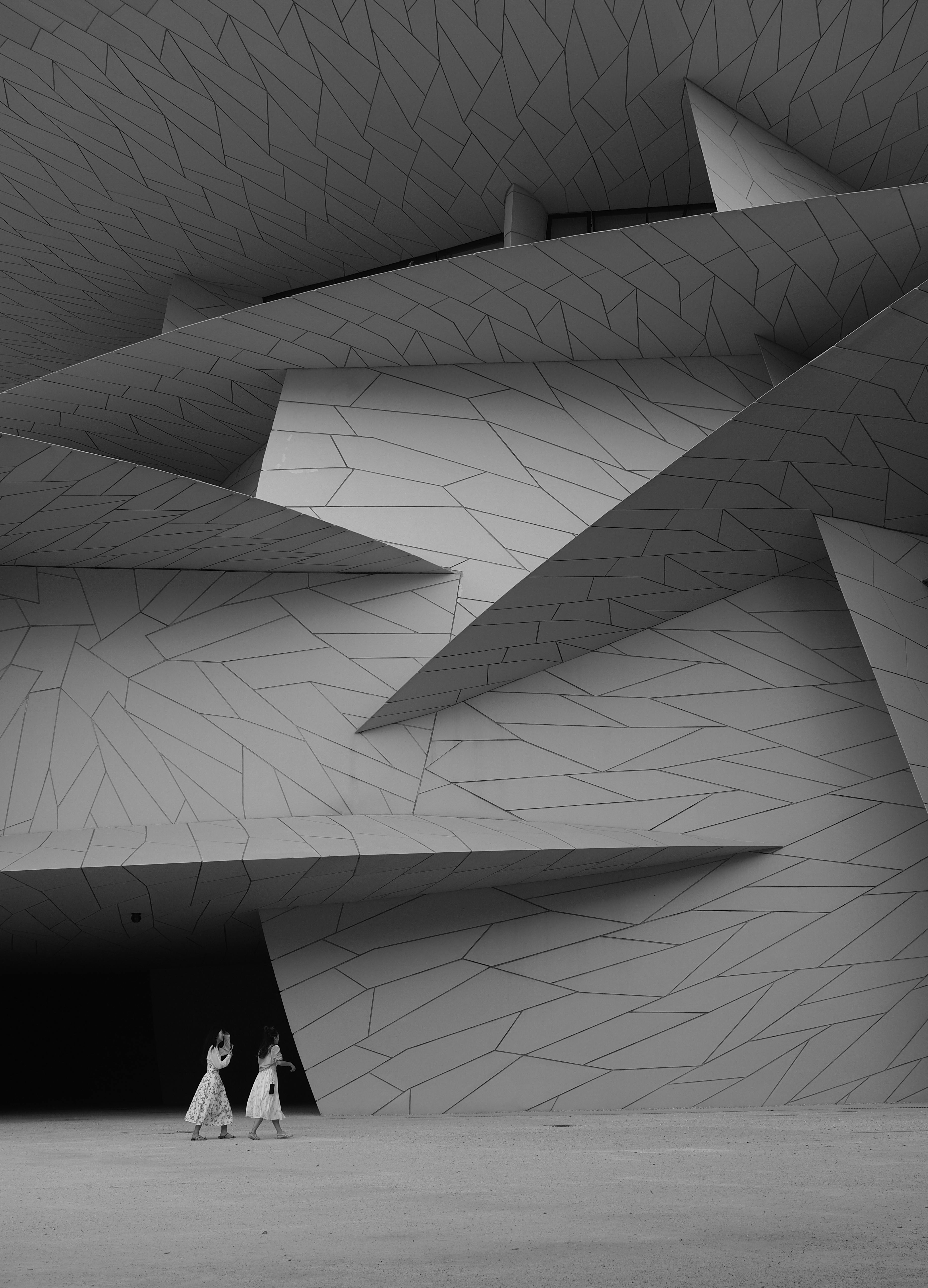Striking monochrome image of Doha's modern architecture with two figures.