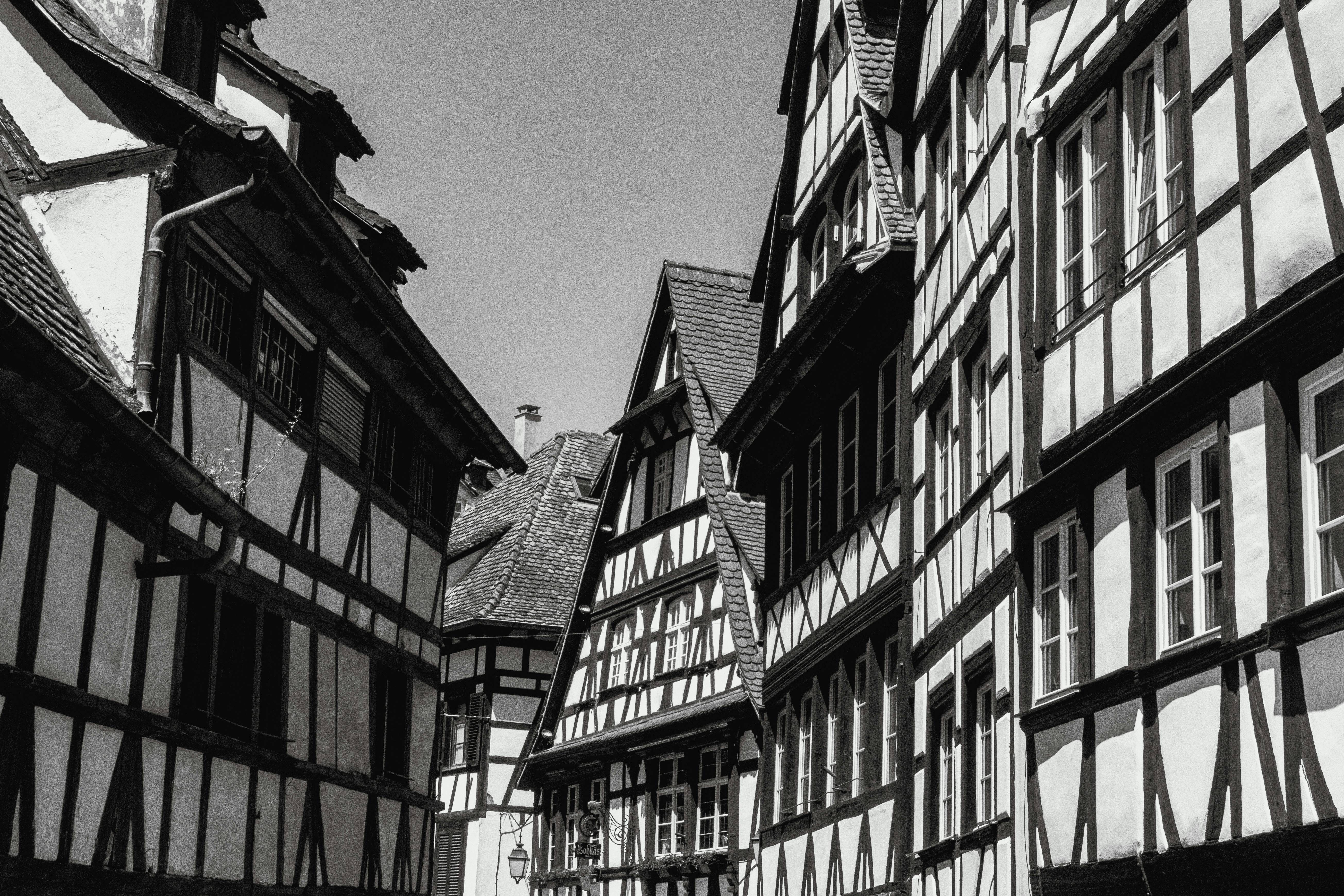 Historical half-timbered houses in Strasbourg's old town, captured in black and white for a timeless feel.