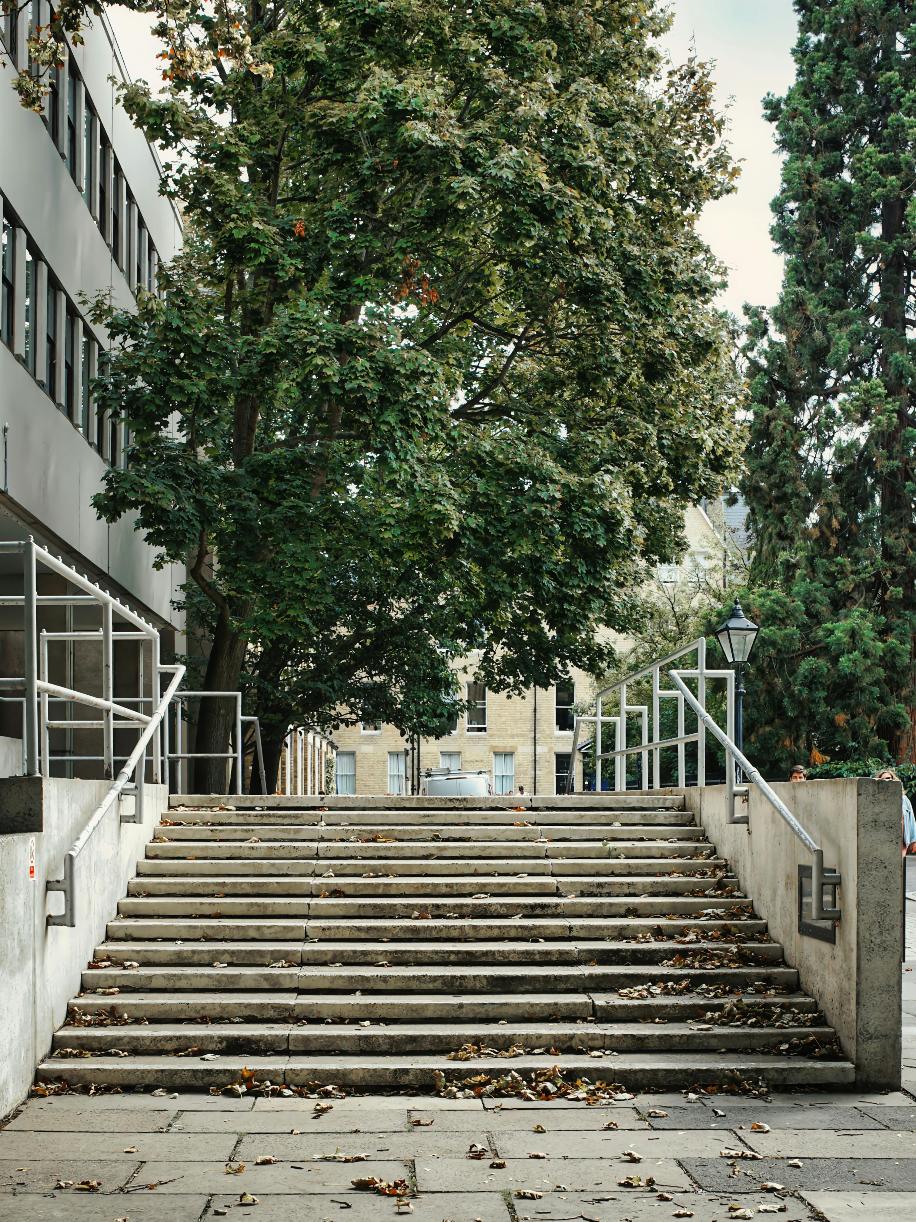 Elegant stone steps surrounded by trees and buildings in Oxford, capturing the essence of autumn.