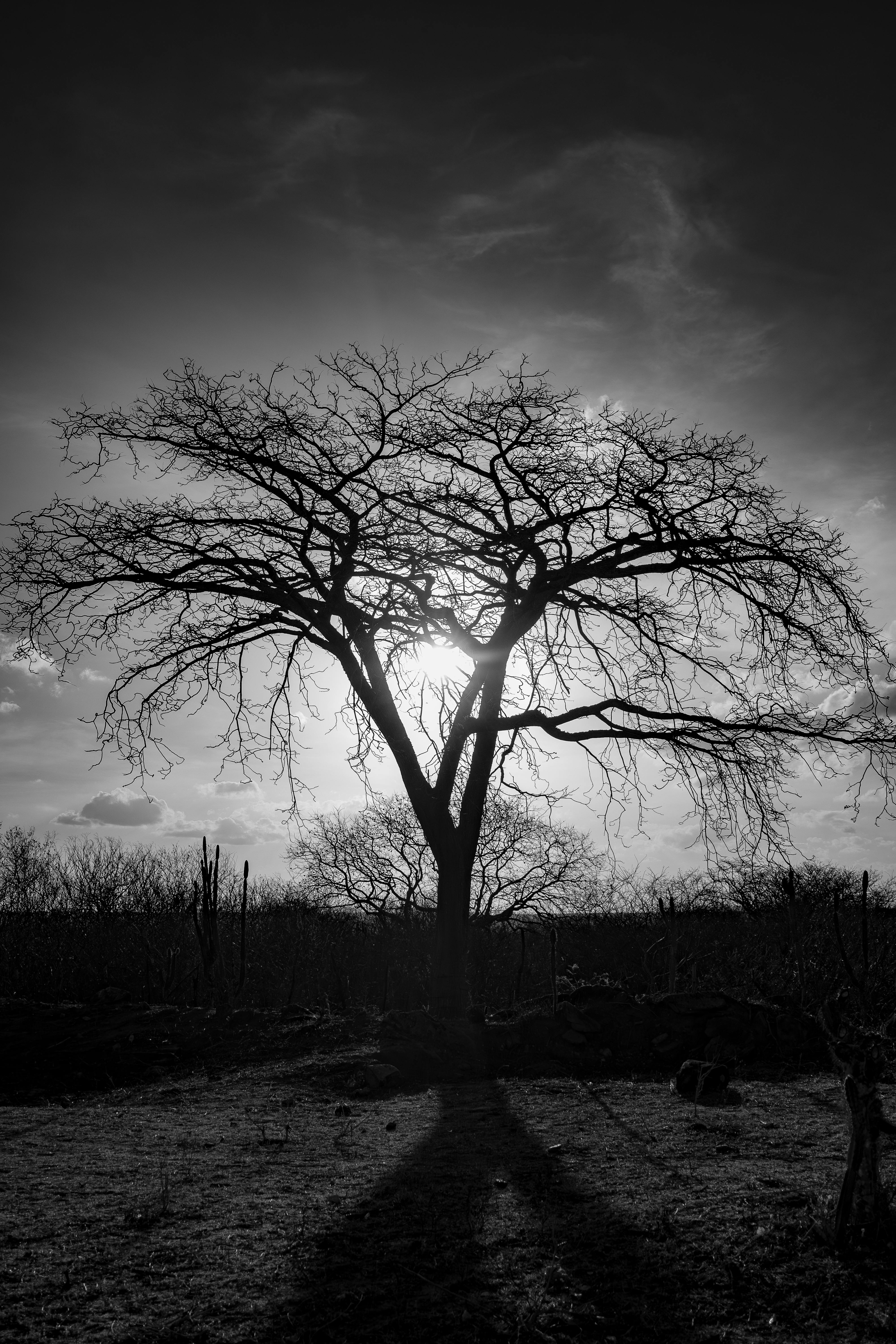 Dramatic black and white silhouette of a leafless tree against a sunset sky.