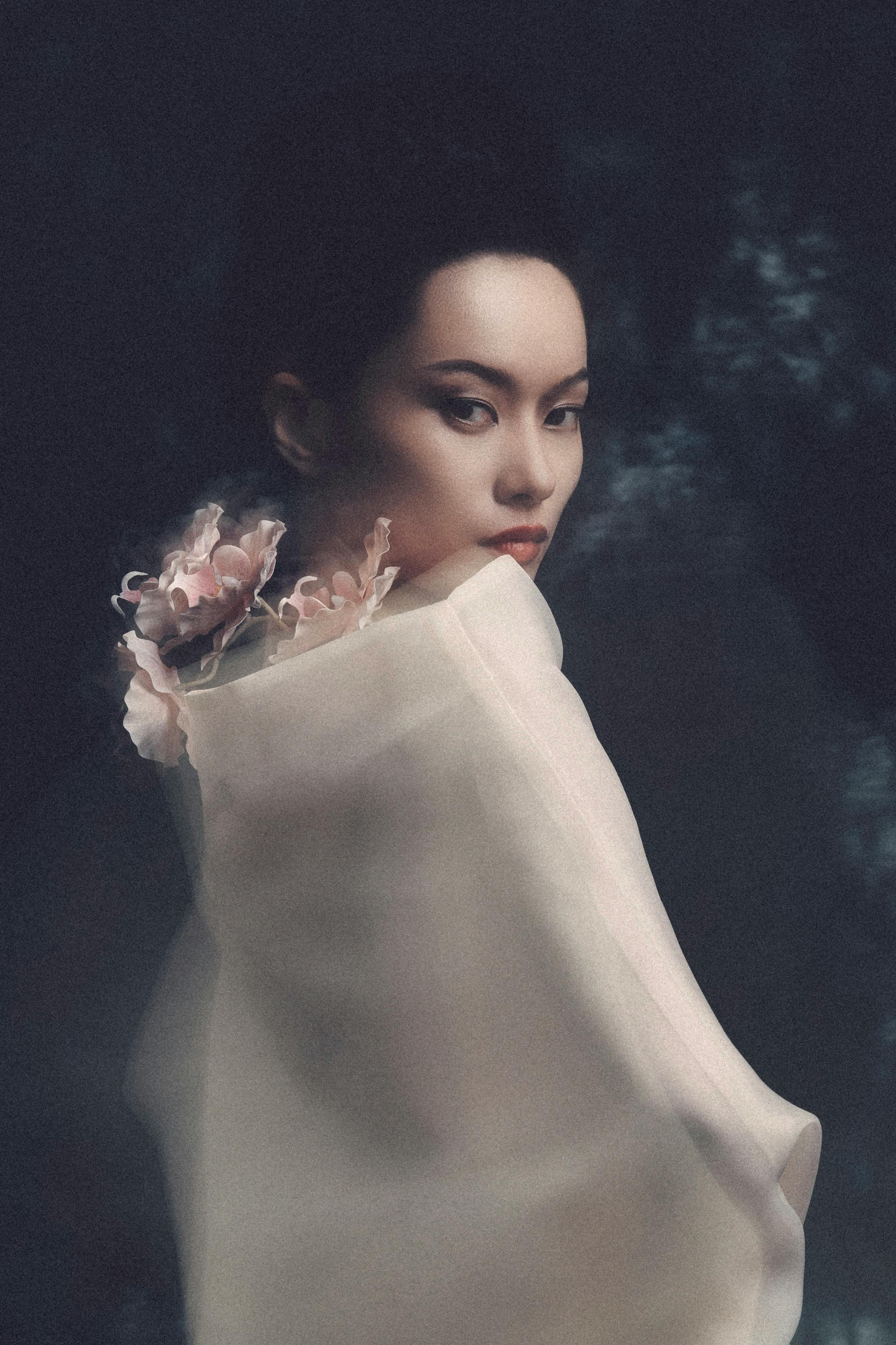 A serene and artistic portrait of a woman with floral design on fabric, exuding elegance.