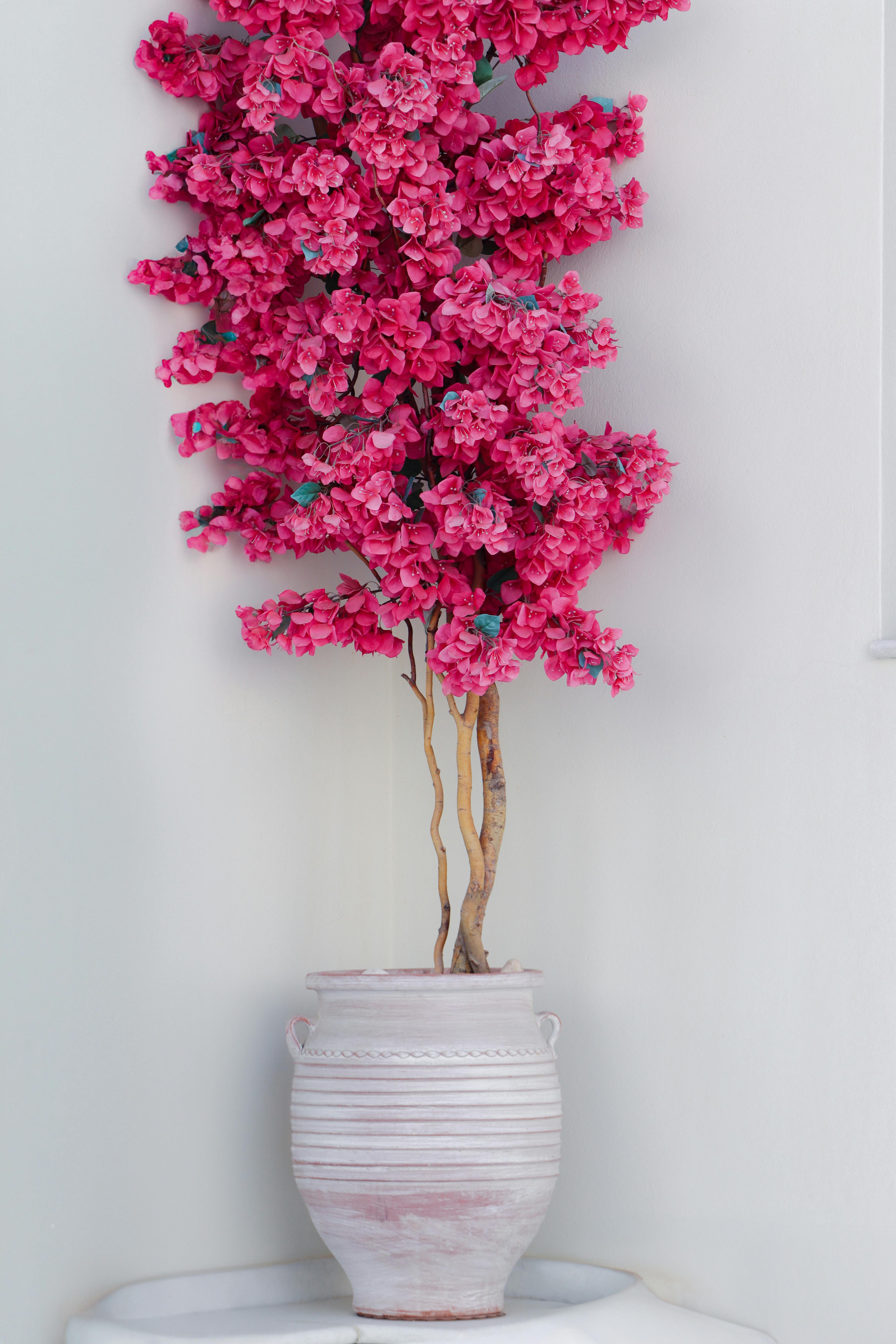 Beautiful pink bougainvillea in a white vase against a minimalist white wall.