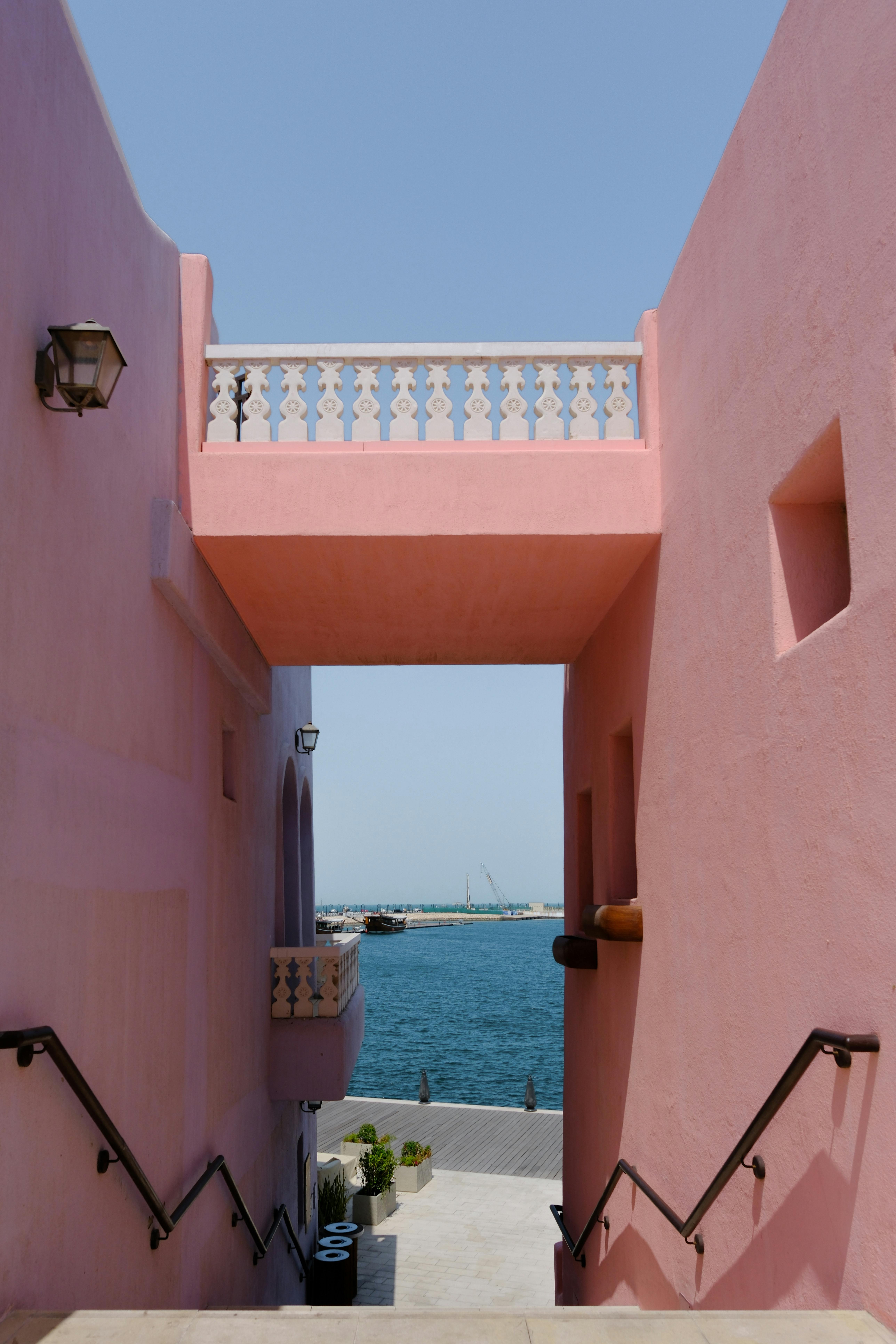 Pink buildings frame a serene sea view under a clear blue sky.
