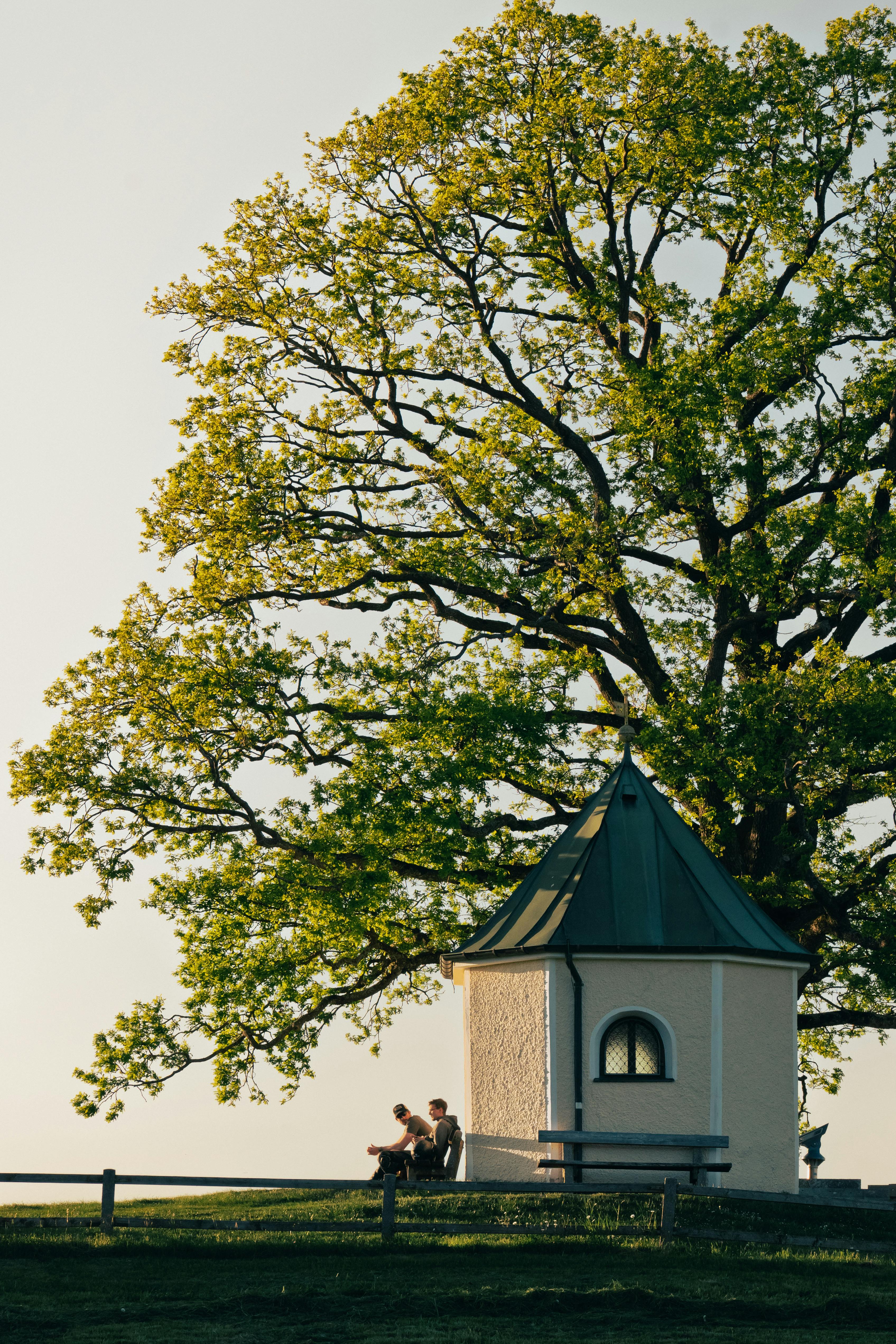 Serene scene with people relaxing by a large tree and gazebo at sunset in a park.