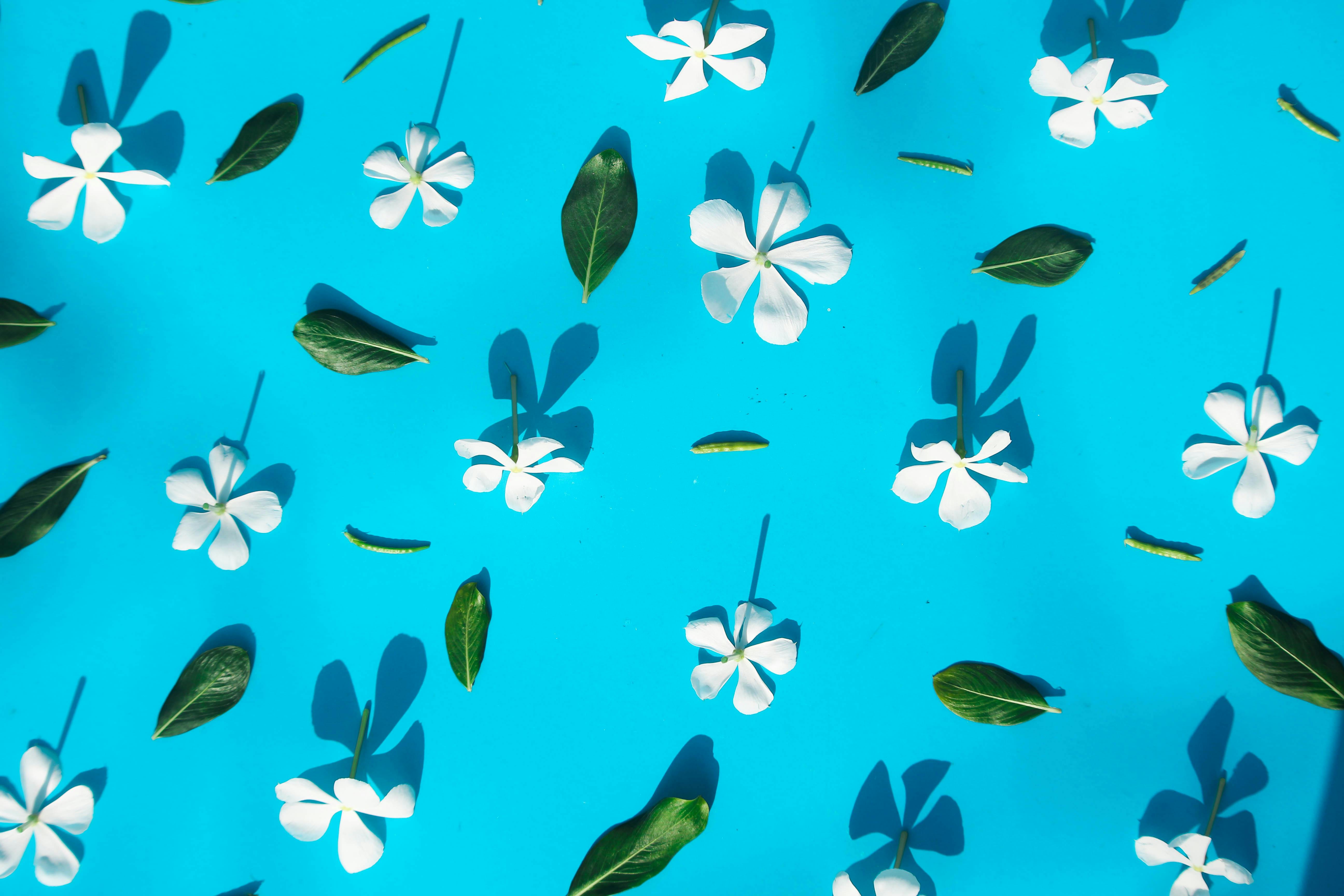 Minimalist flat lay of white jasmine flowers and green leaves on a bright blue surface