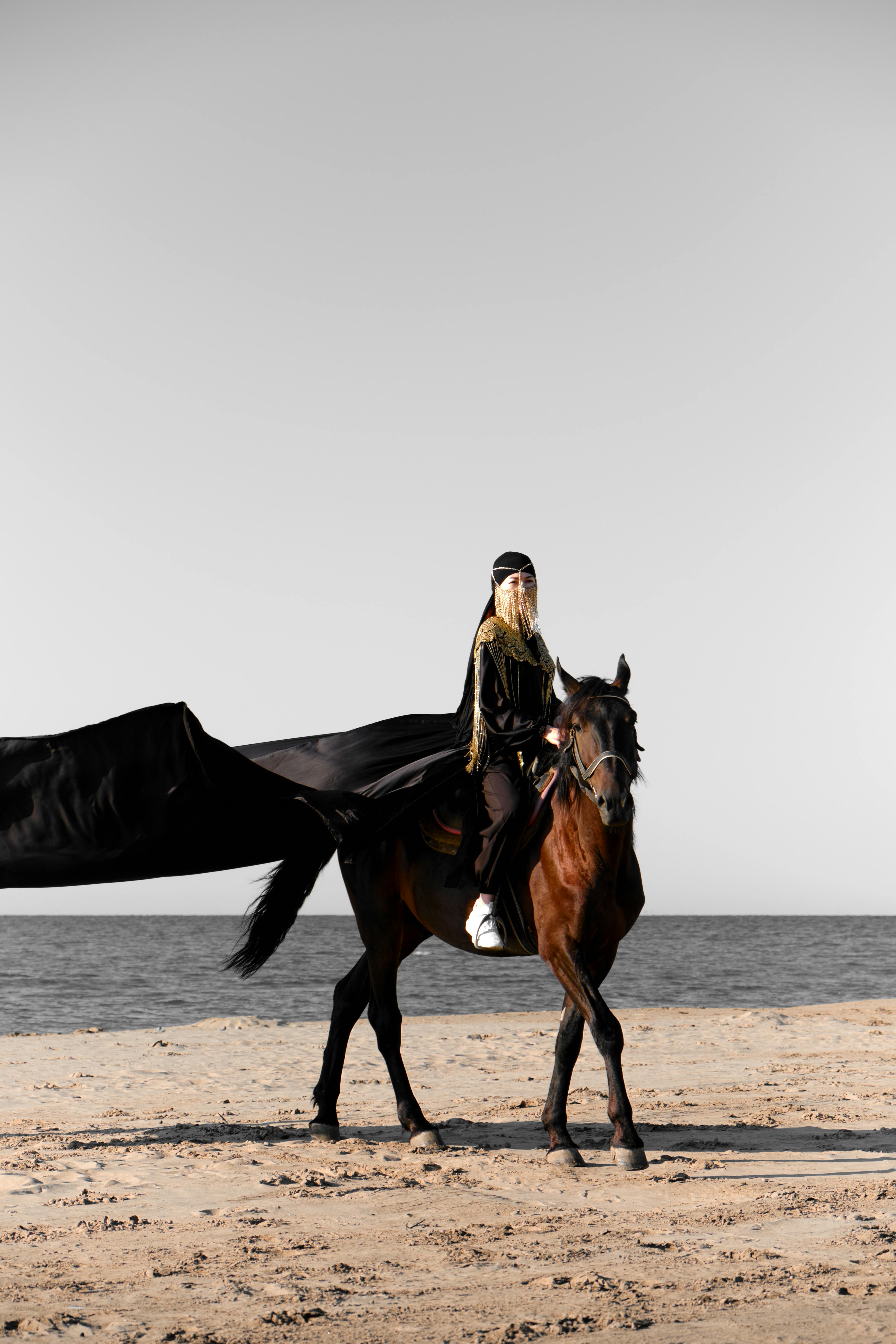 A woman in traditional attire riding a horse on a serene sandy beach.