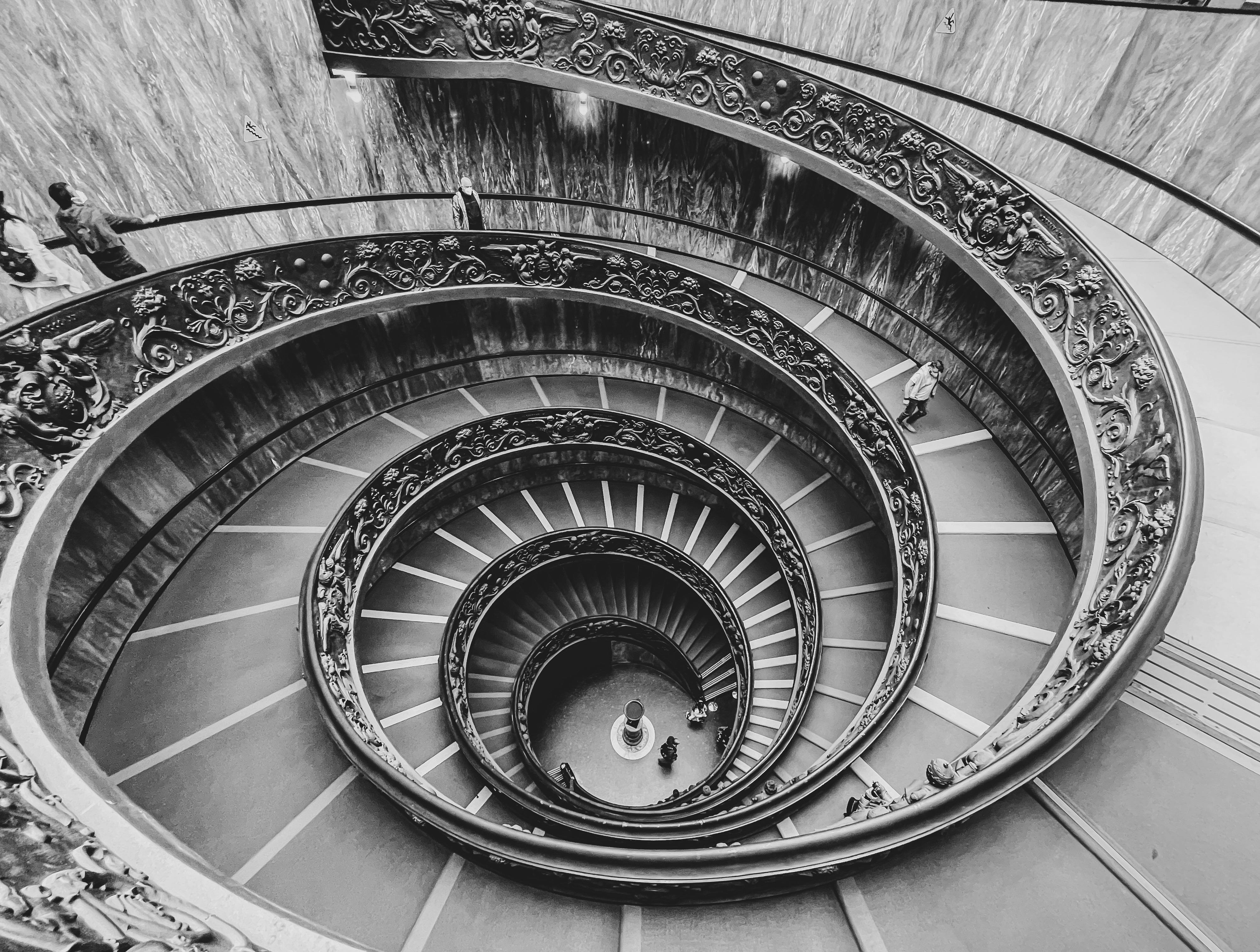 Dramatic black and white view of intricate spiral staircase, showcasing architectural elegance.