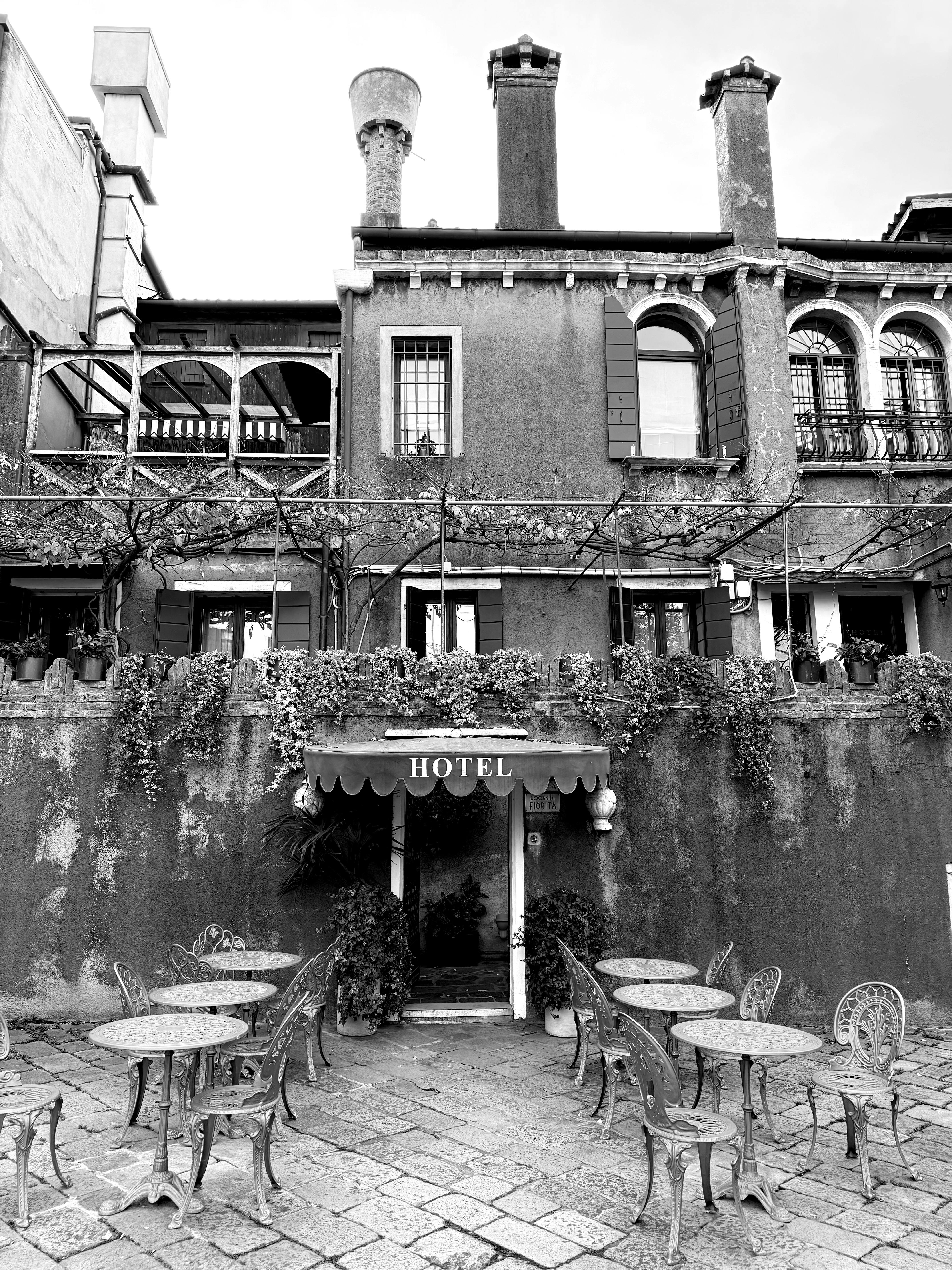 Vintage Italian trattoria entrance with rustic wooden door and potted plants in Milan's urban scene.