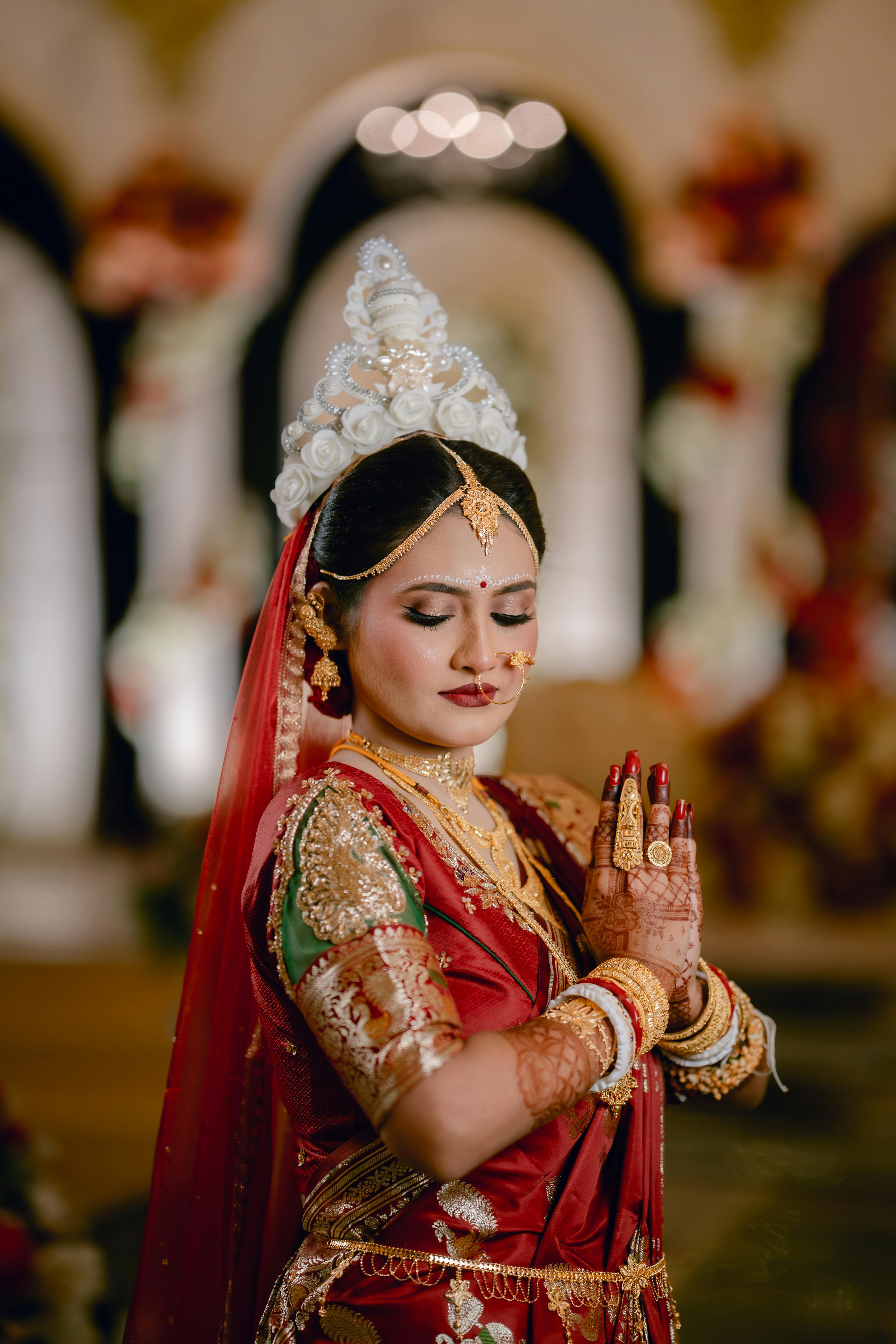 A beautiful traditional Bengali bride in ornate red sari and gold jewelry, praying.