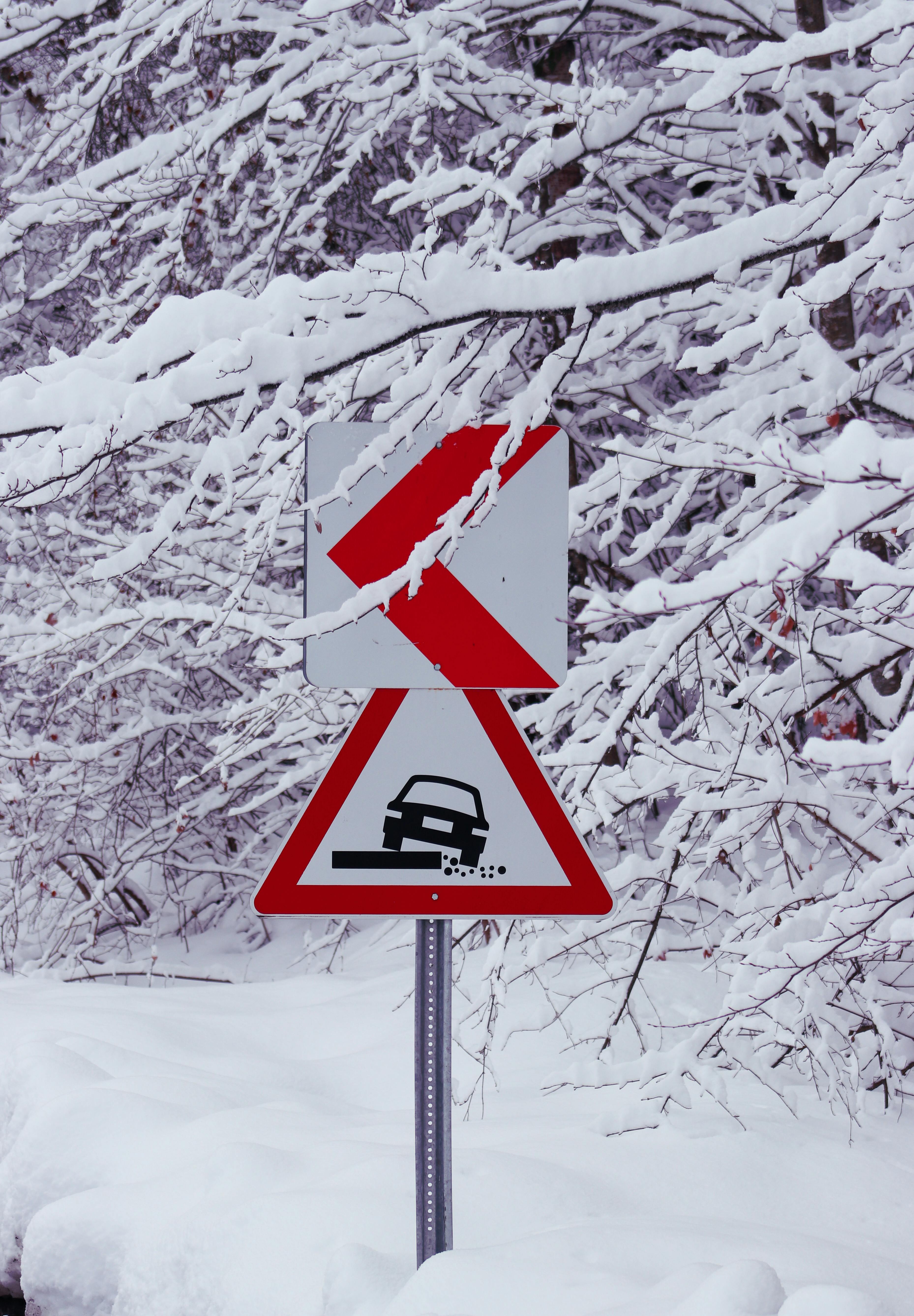 Warning sign in snow-covered forest indicating slippery road conditions. Perfect for winter travel themes.