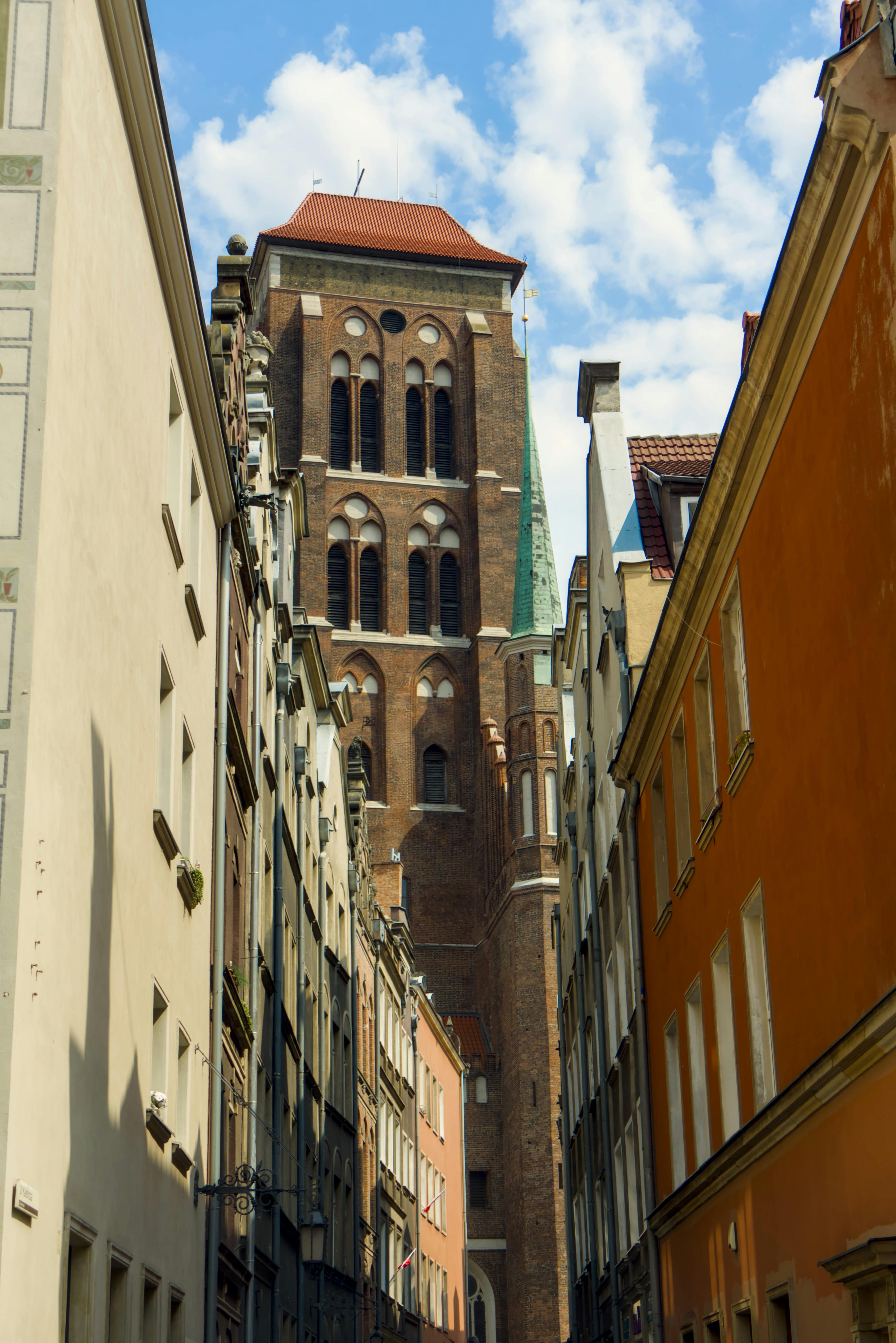 Towering view of St. Mary's Basilica against a bright sky in Gdańsk's historic Old Town.