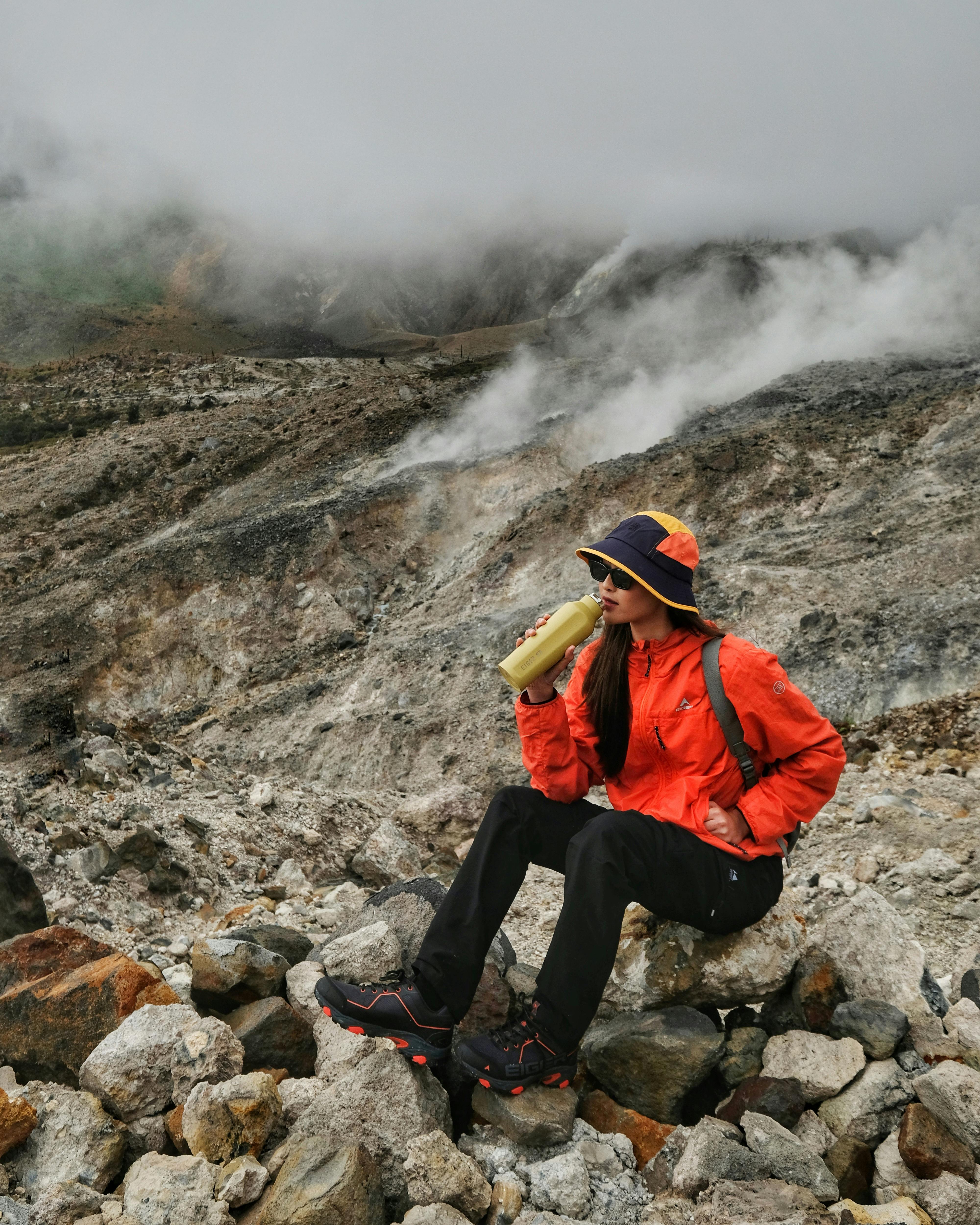 A woman in a red jacket drinks from a bottle while hiking a rugged mountain trail on a misty day.