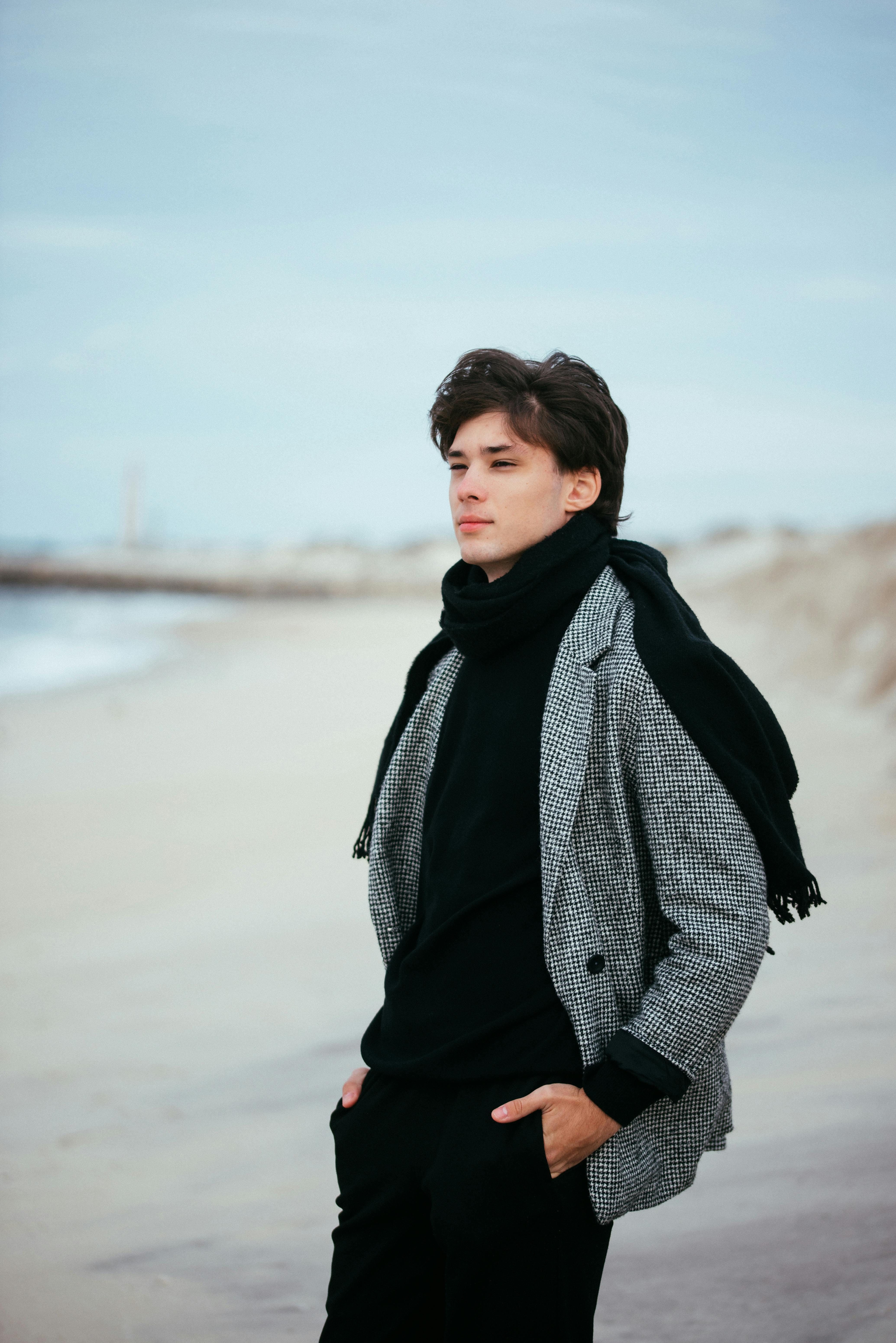 Fashionable young man in coat and scarf stands pensively on a deserted beach.