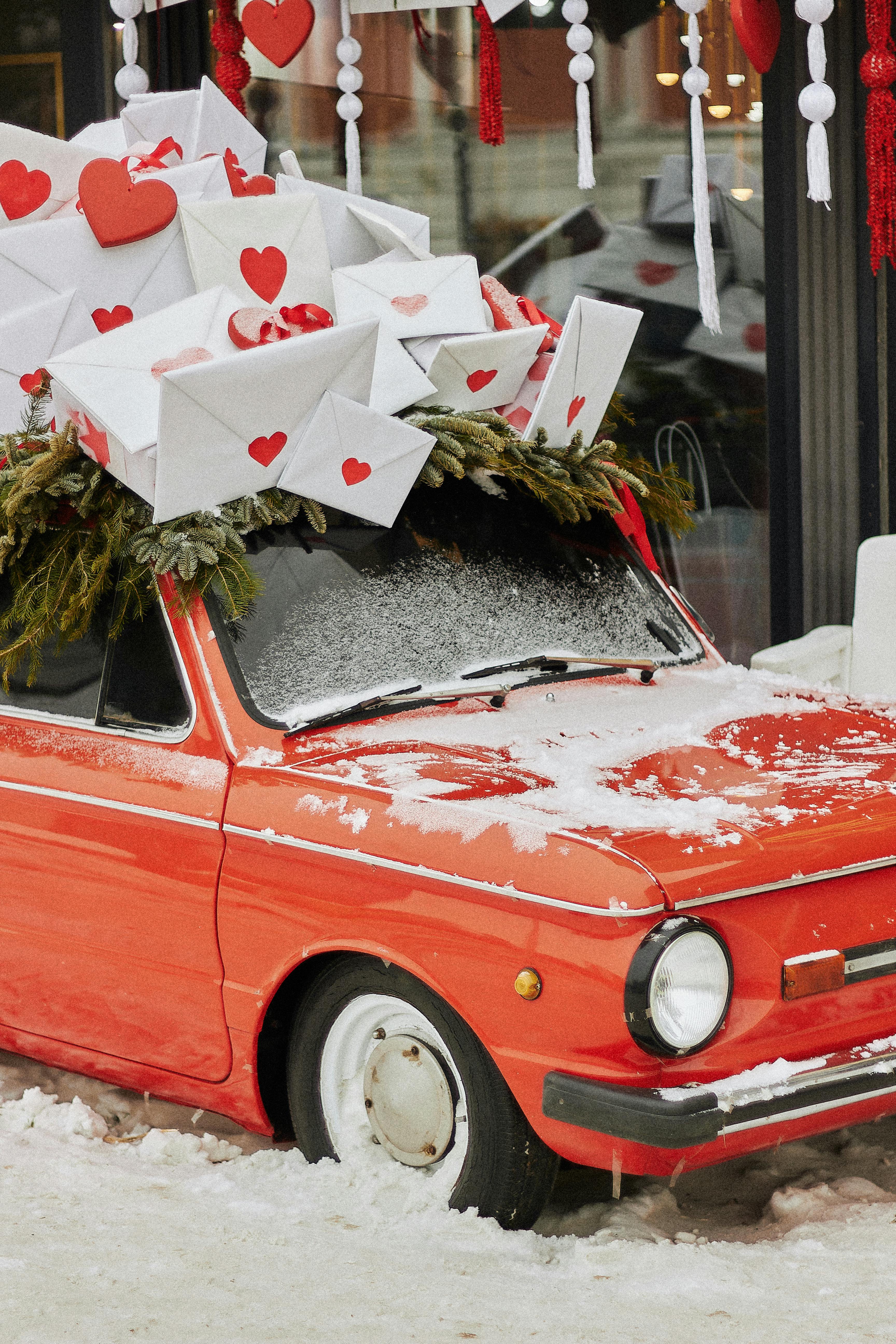 Red vintage car covered in snow with love letters and hearts, creating a romantic winter scene.