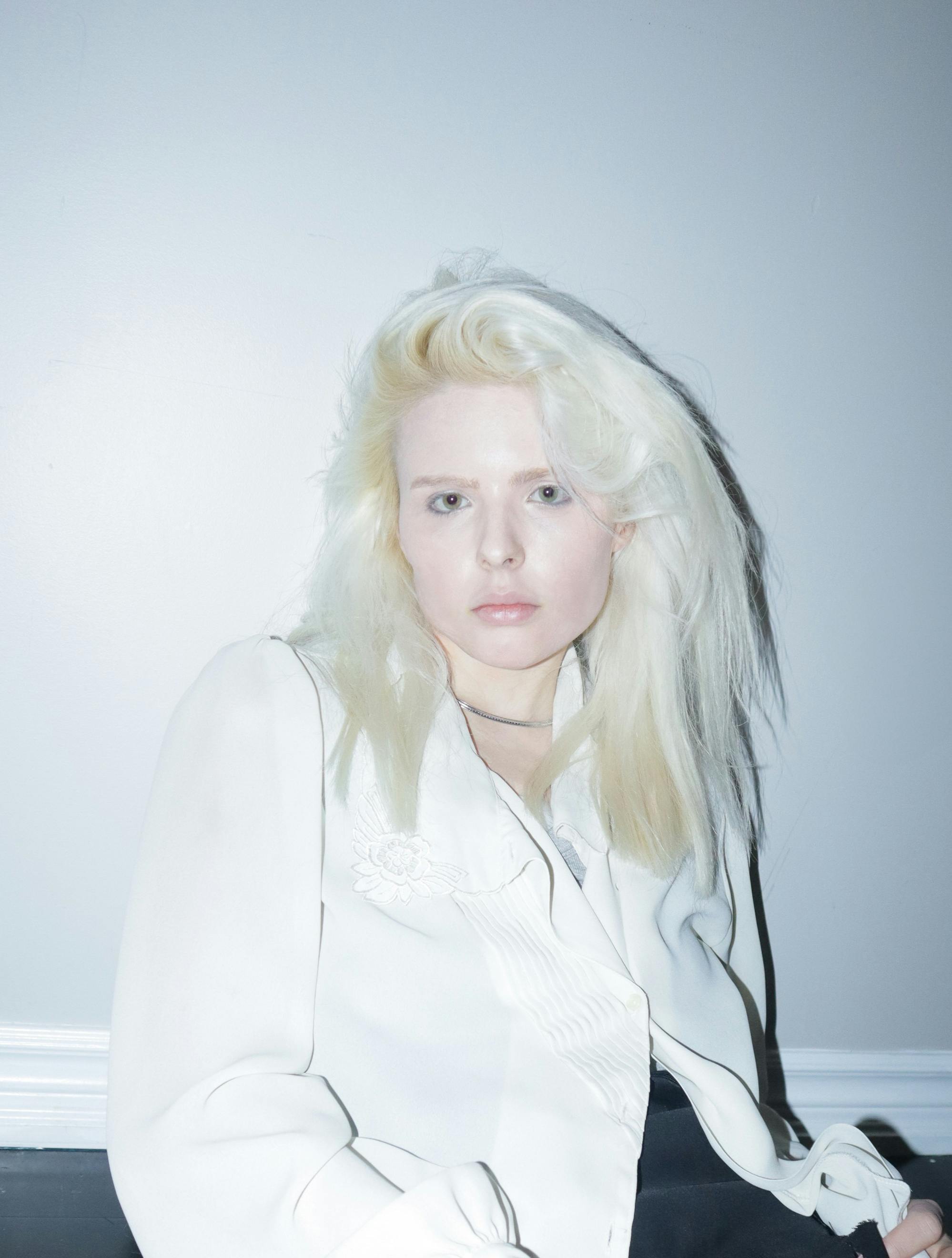 Elegant portrait of a young woman with blond hair in a white outfit against a minimal background.