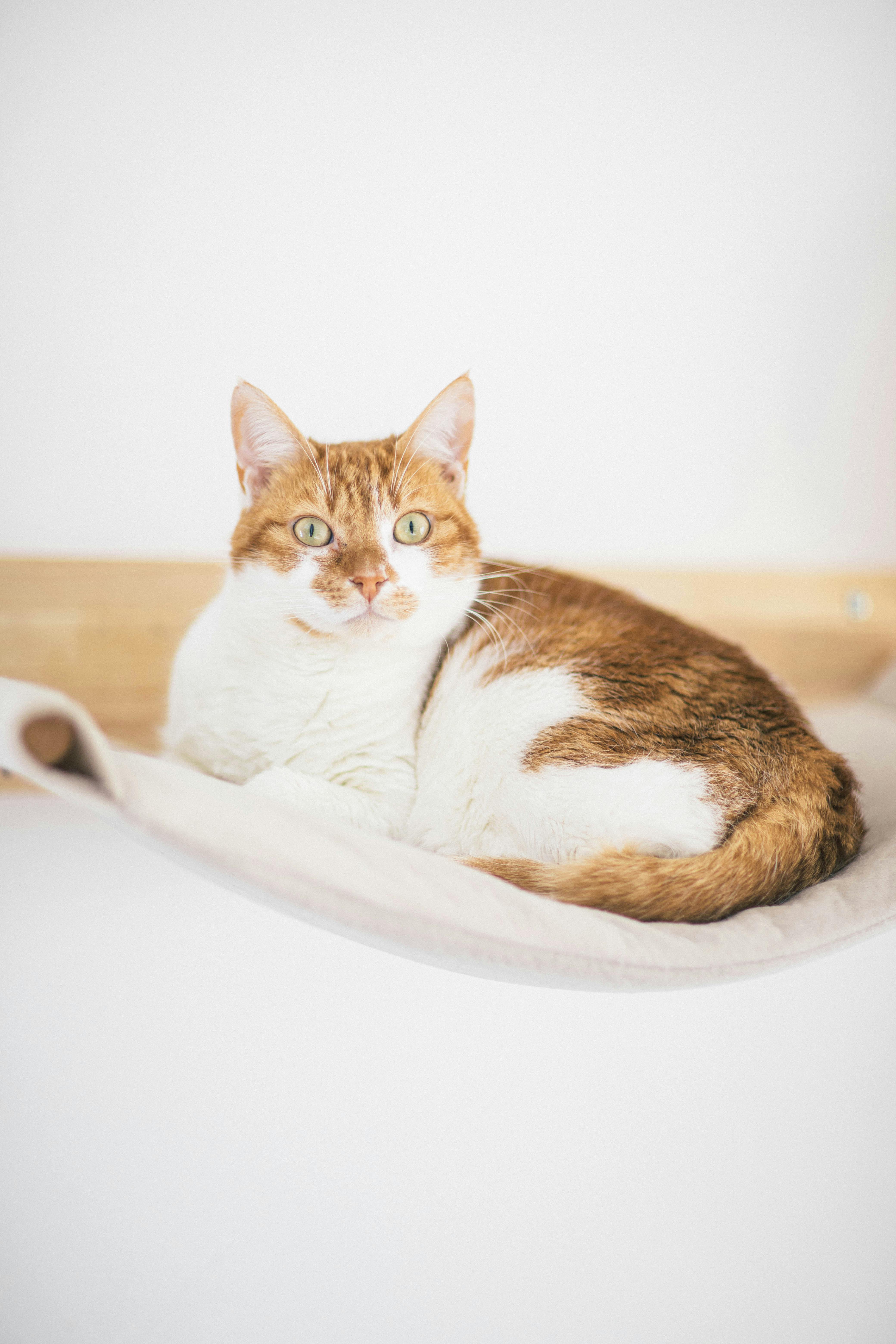 Lovely tabby cat lounging comfortably on a soft white blanket indoors.