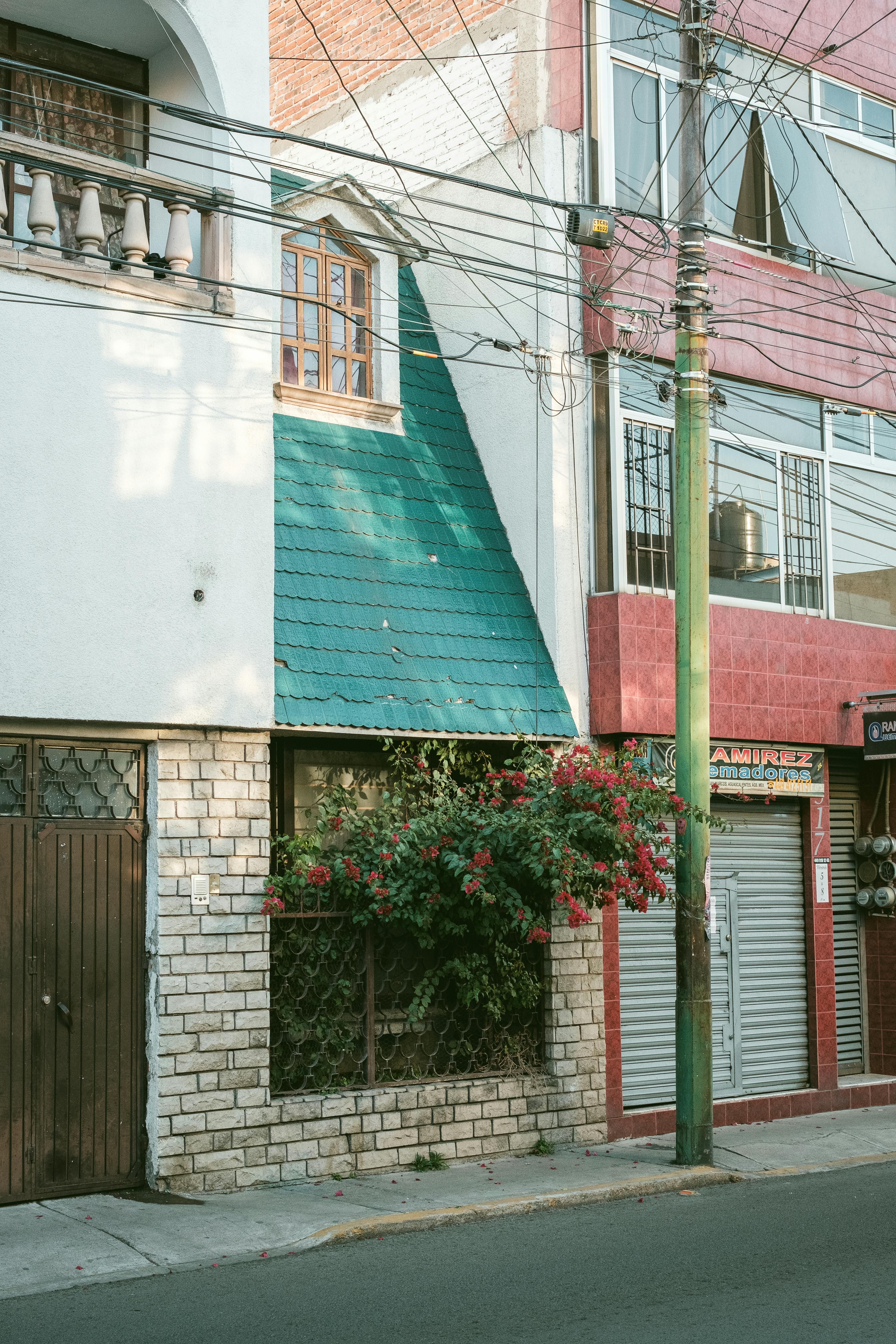 A vibrant urban building facade with green and red accents, featuring lush flowers.
