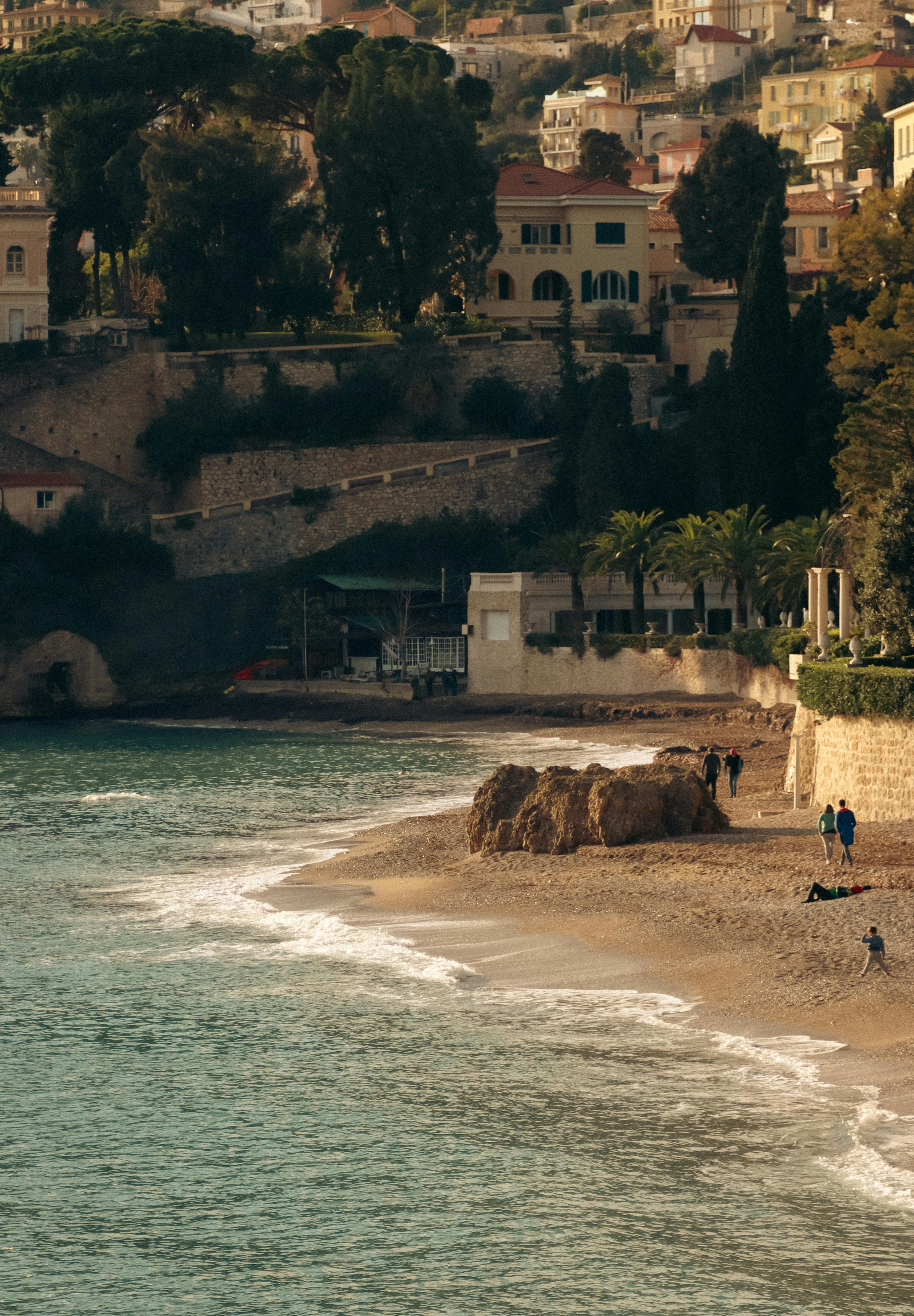 Charming Mediterranean coastline with sandy beach and seaside buildings at sunset.