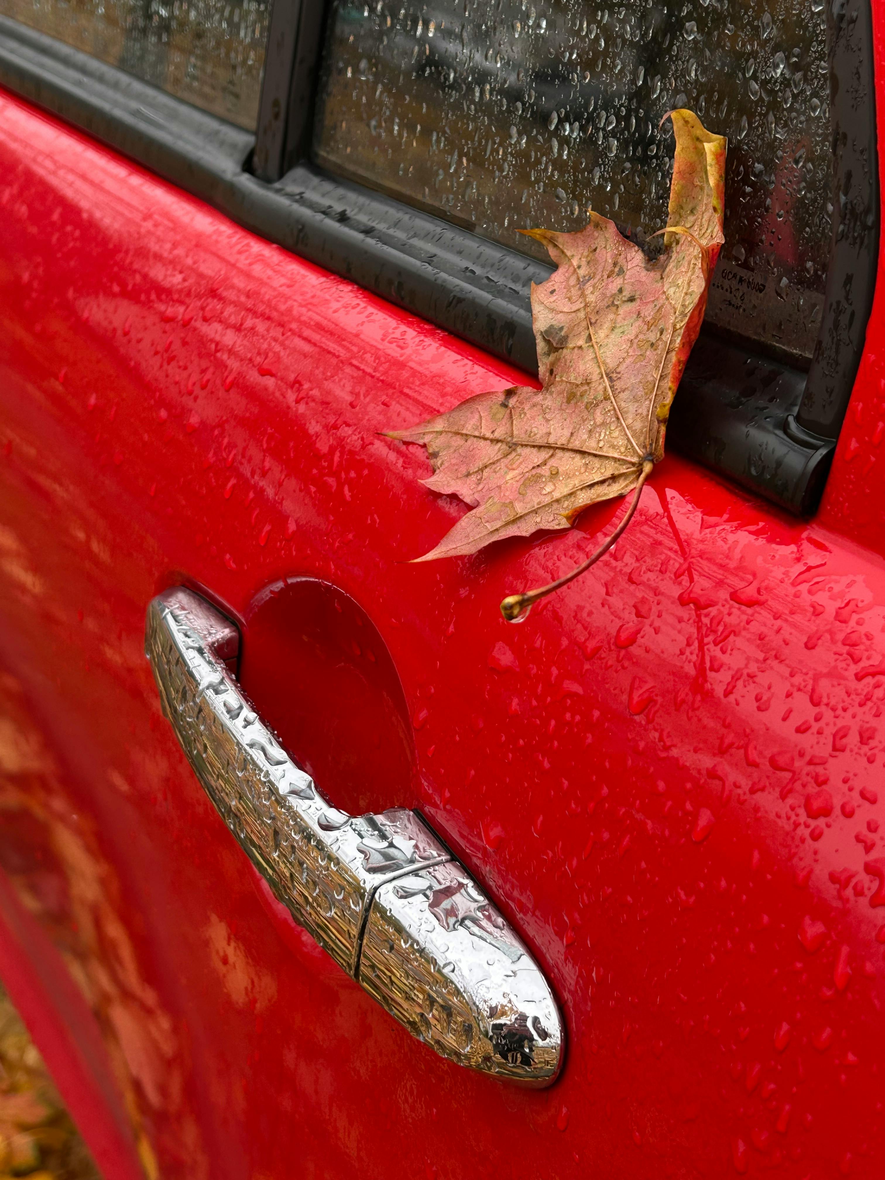 A single autumn leaf rests on a rain-soaked red car door, capturing fall's essence.
