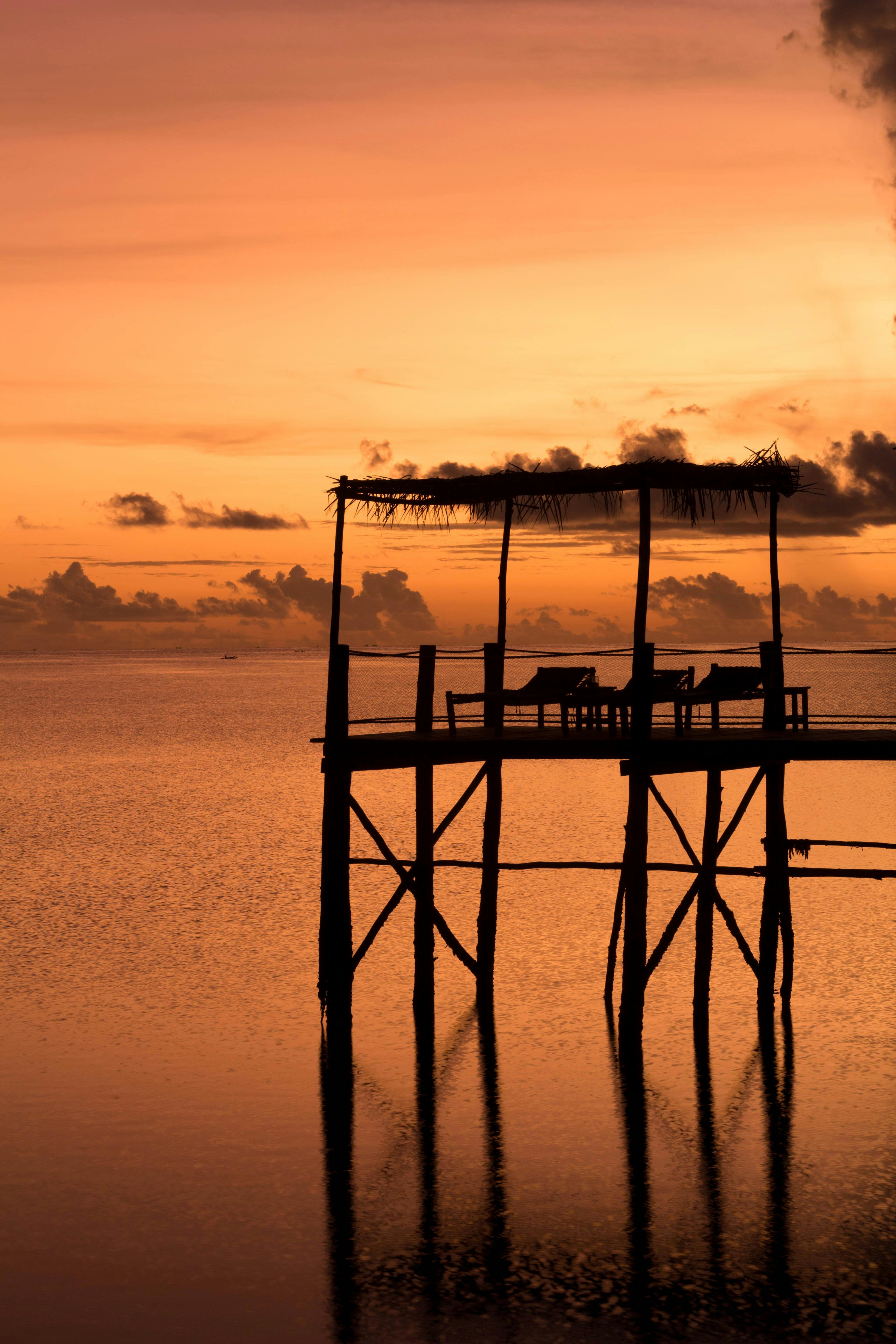 A tranquil silhouette of a pier in Zanzibar during a vibrant sunset over the ocean.