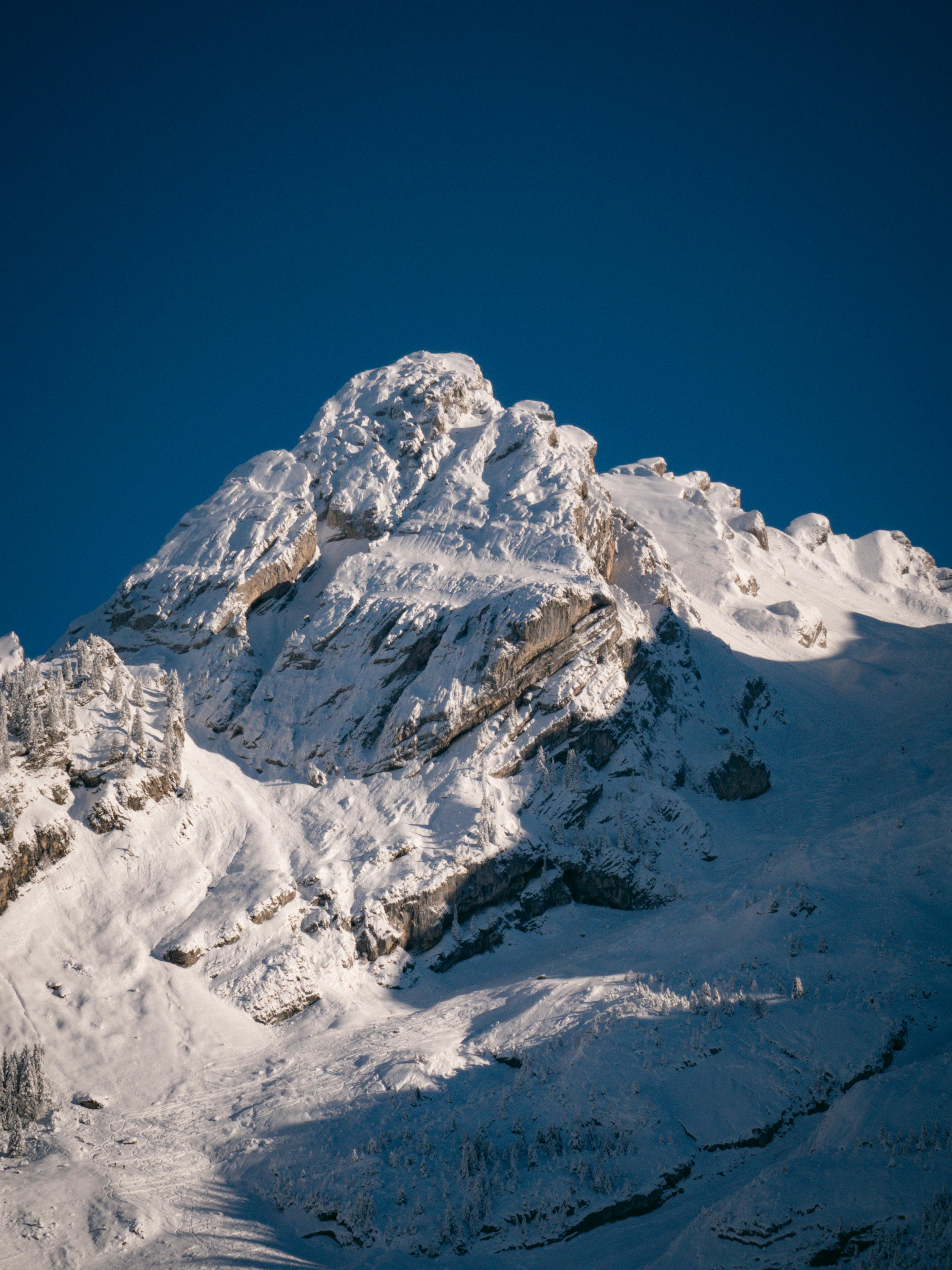 Stunning snow-covered mountain peak under clear blue skies in Le Grand-Bornand, France, capturing winter's serene beauty.