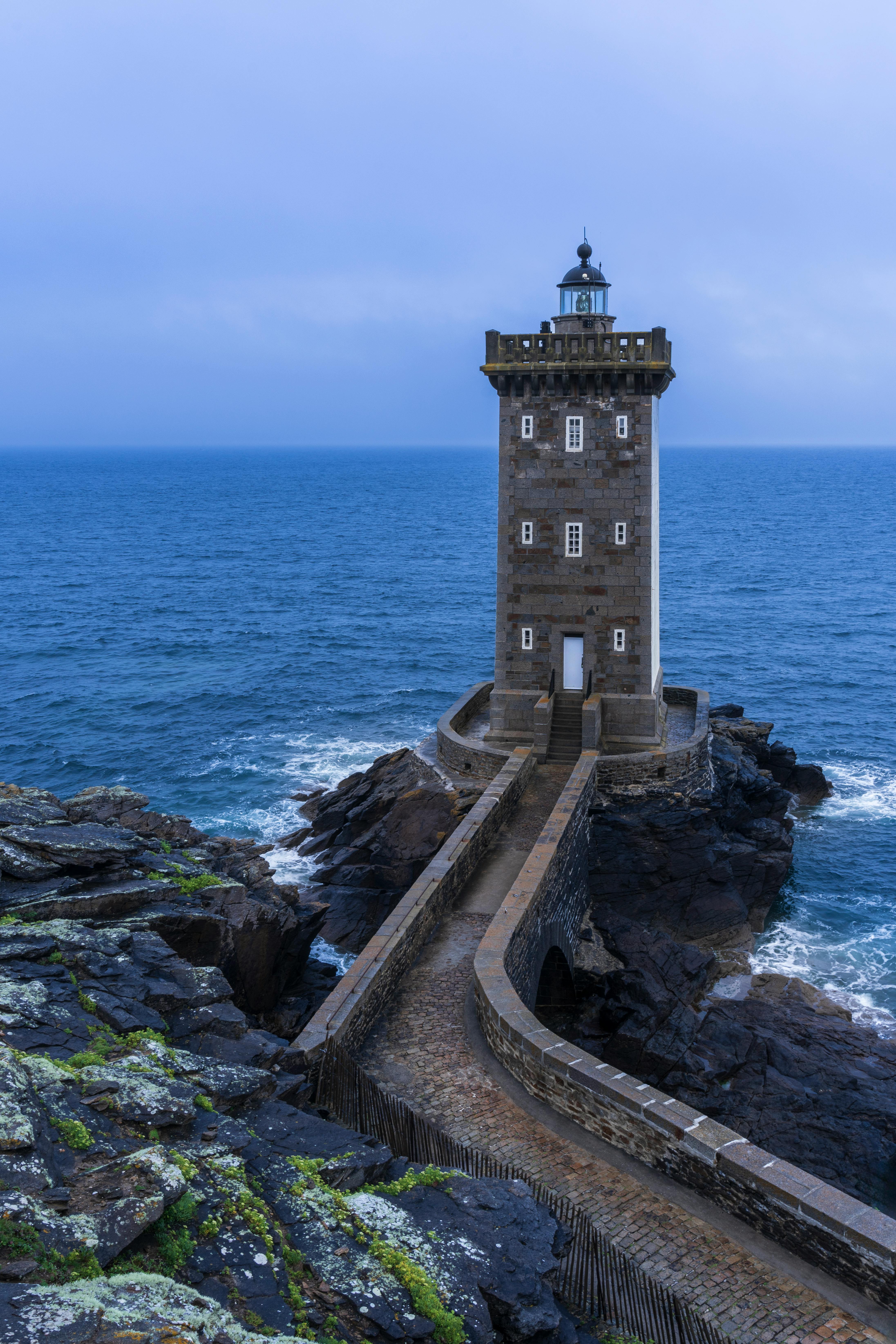 Beautiful lighthouse on Brettagne's rocky coast with waves crashing around.