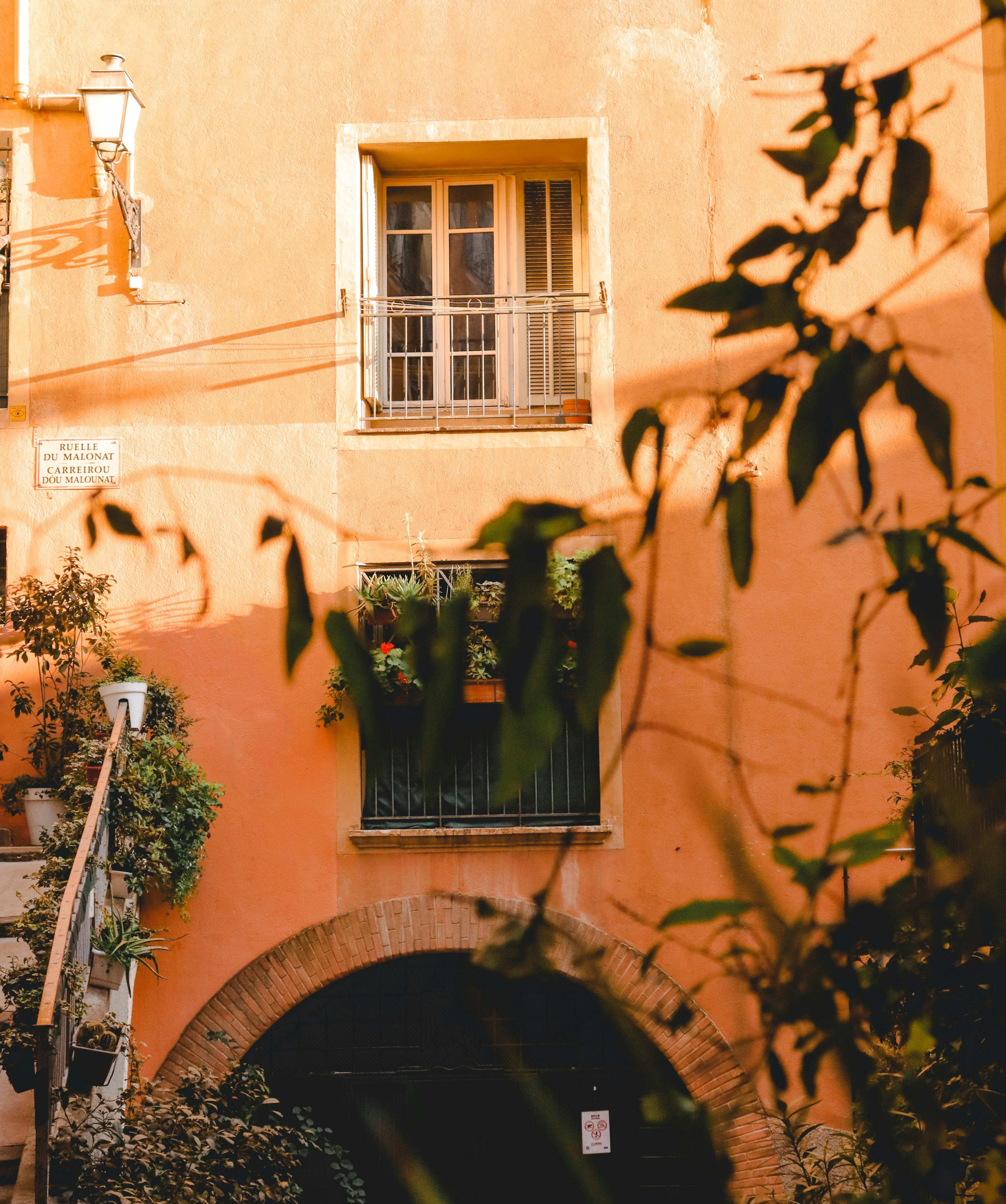Beautiful orange facade with greenery, classic architecture in warm sunlight, Mediterranean feel.
