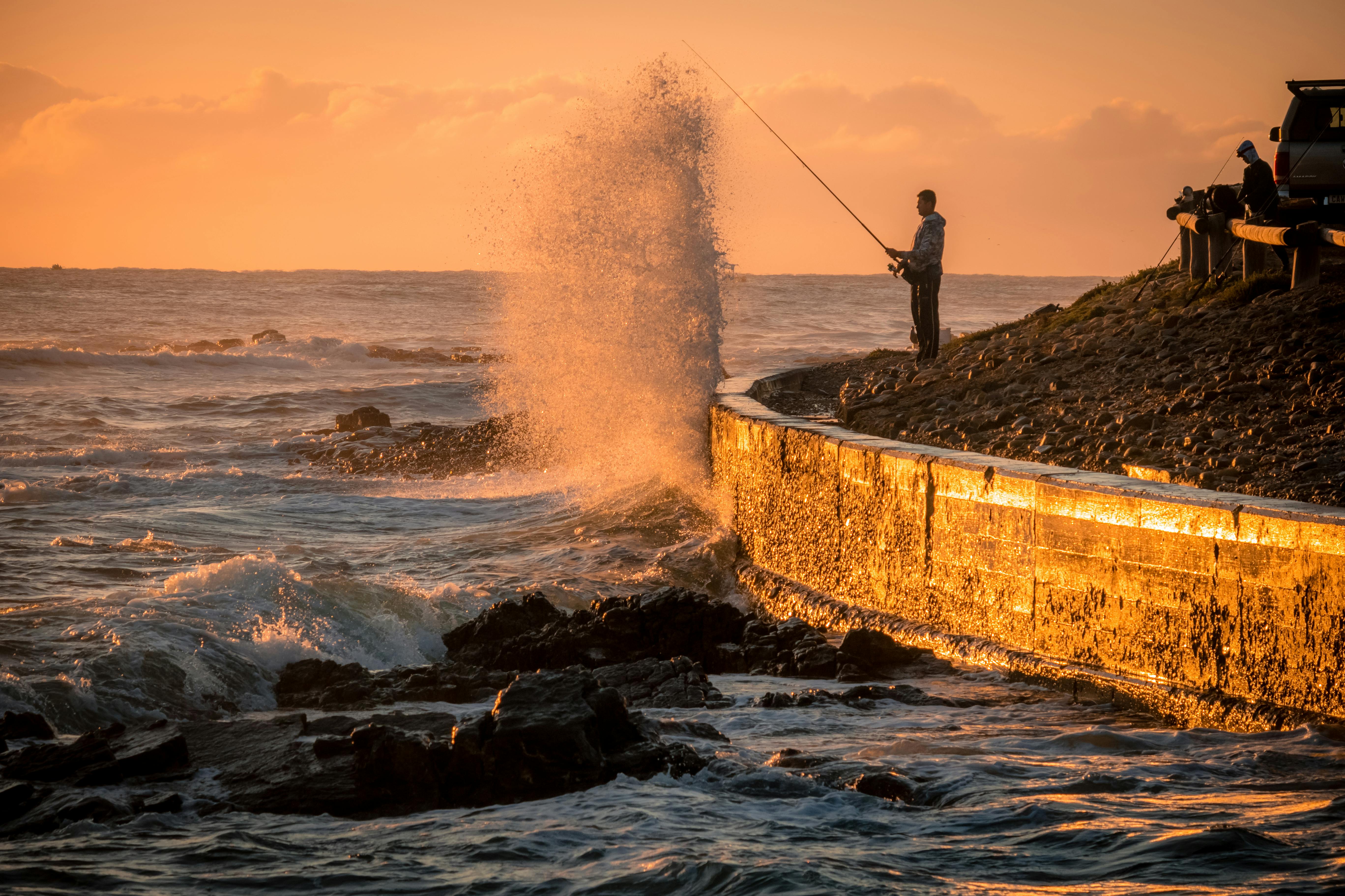 A fisherman casting at sunset with waves crashing in Still Bay, South Africa.