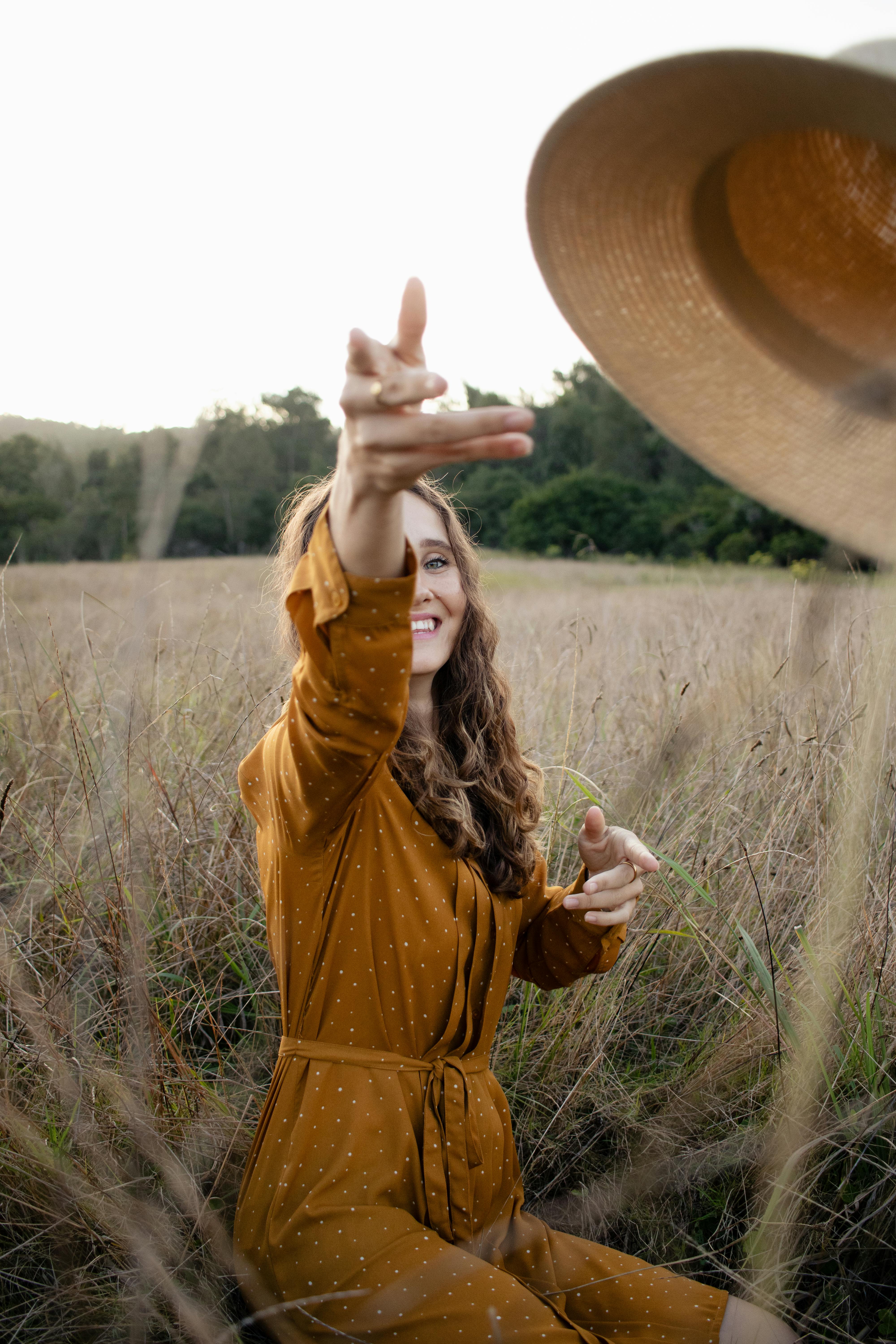A woman in a yellow dress reaches for a straw hat in a sunlit meadow.