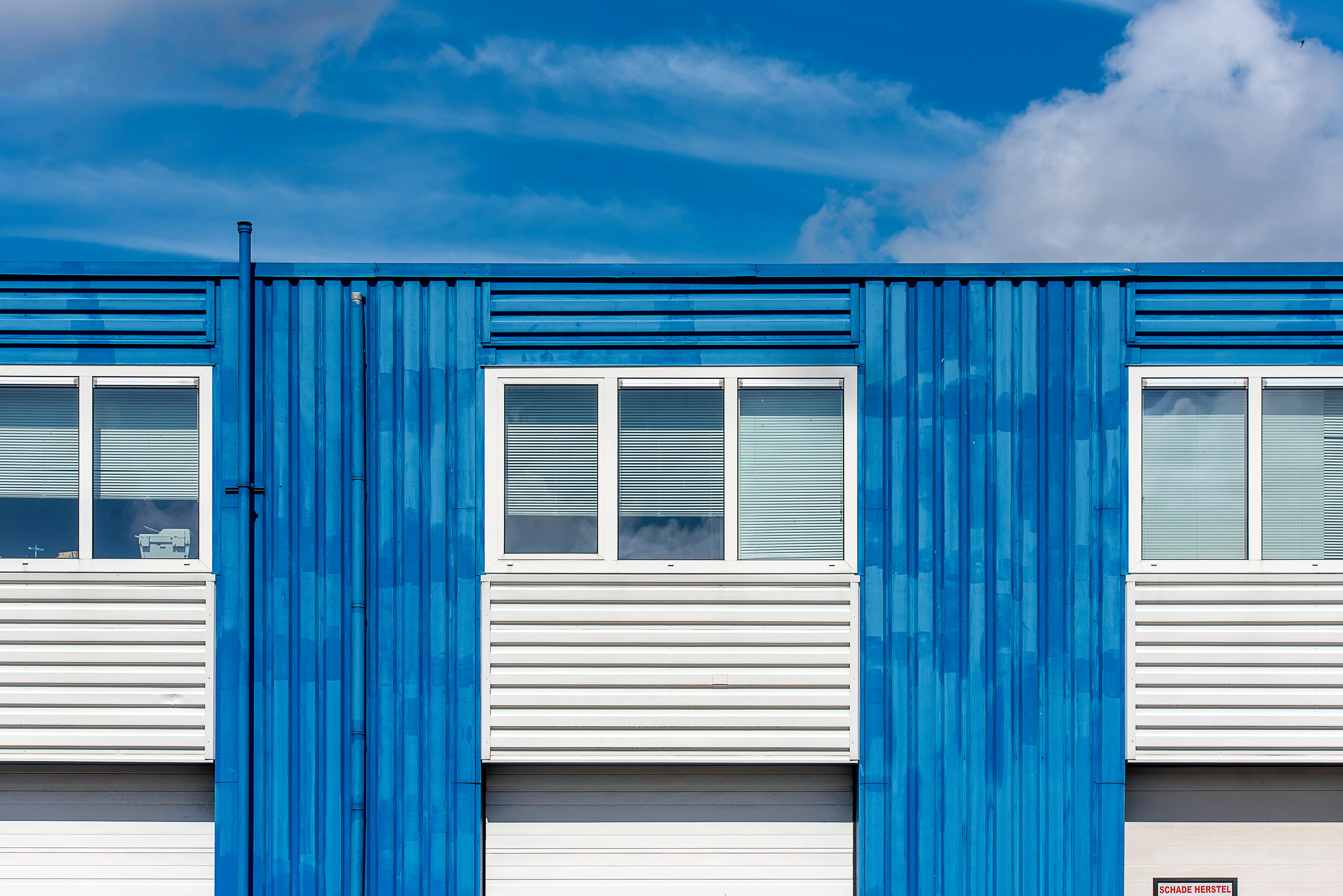 Bright blue facade with white windows under a clear sky, showcasing modern architecture.