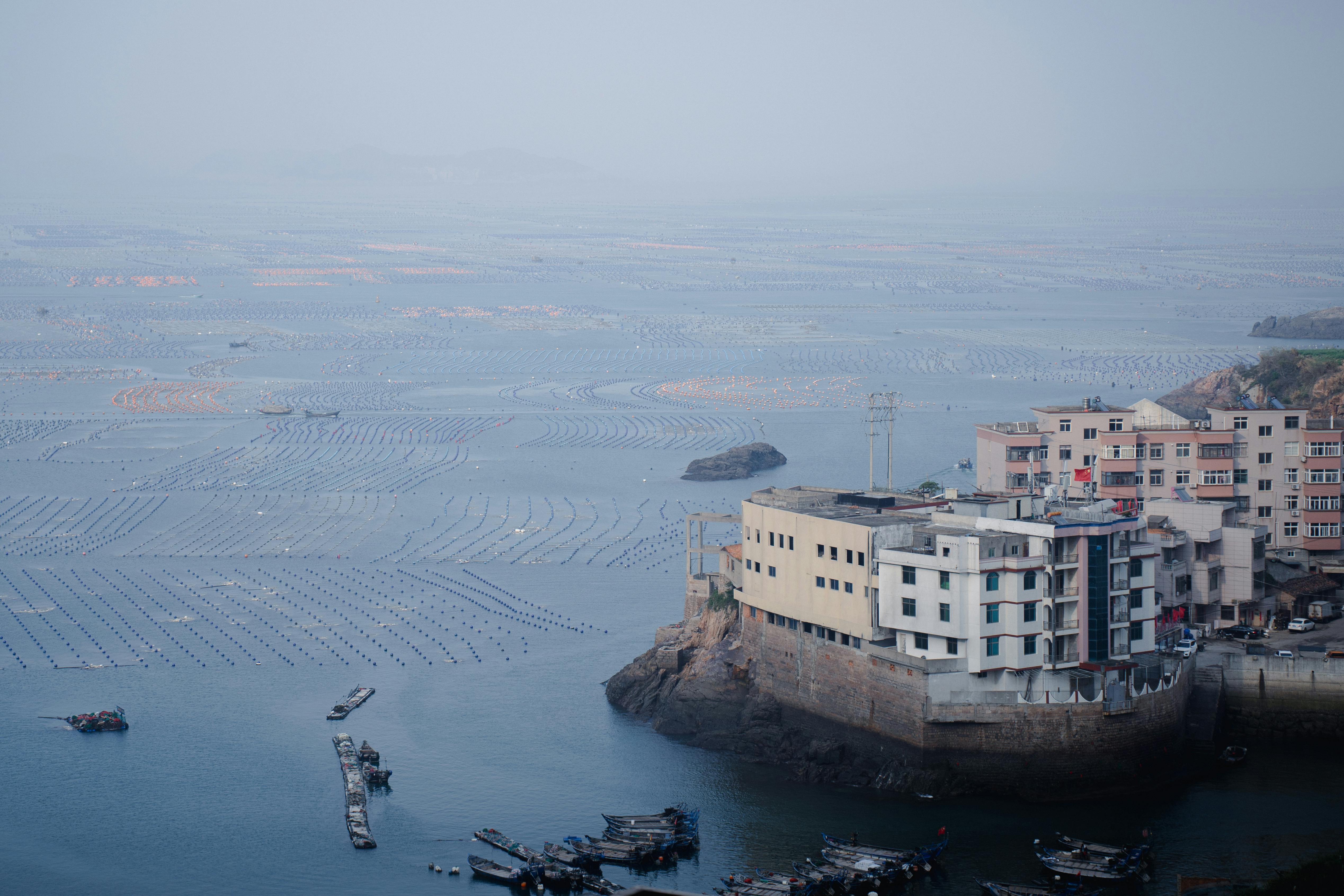 A scenic view of a coastal fishing village overlooking extensive sea farms. Calm and serene atmosphere.