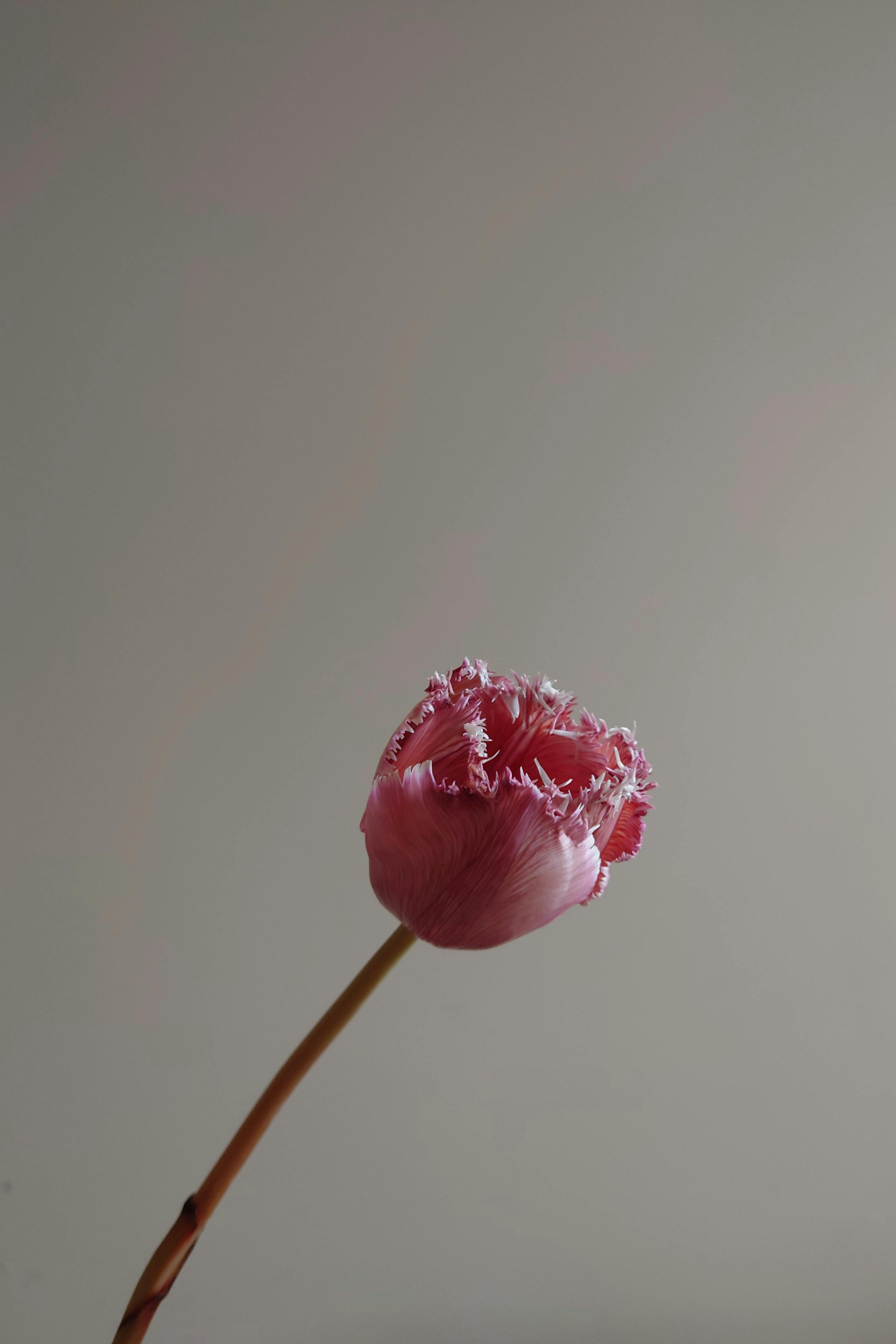 Elegant pink tulip with fringed petals stands out against a neutral gray backdrop.