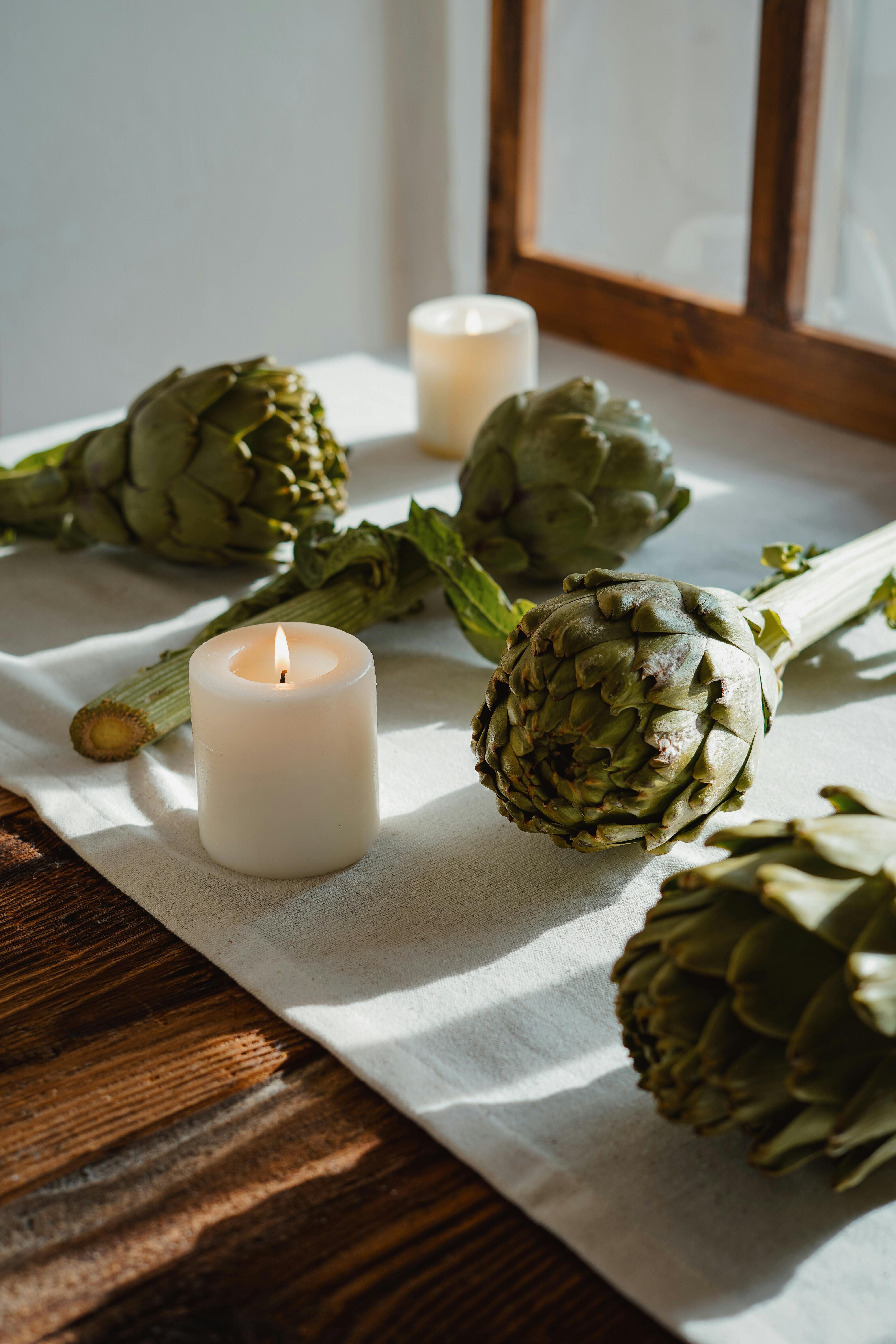 A rustic table with artichokes and candles, creating a warm, inviting scene.