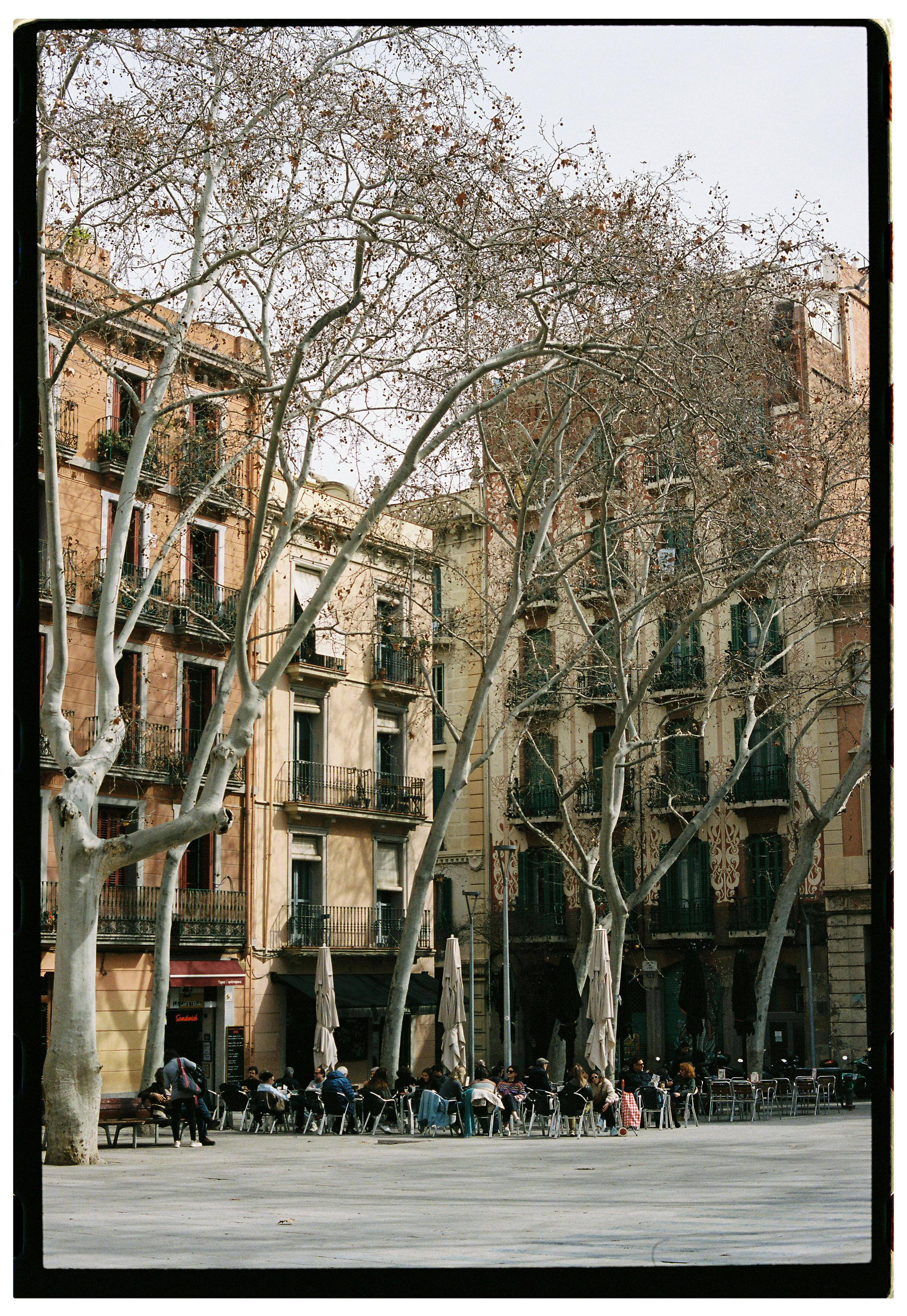 European square with cafes and historic architecture under leafless trees.