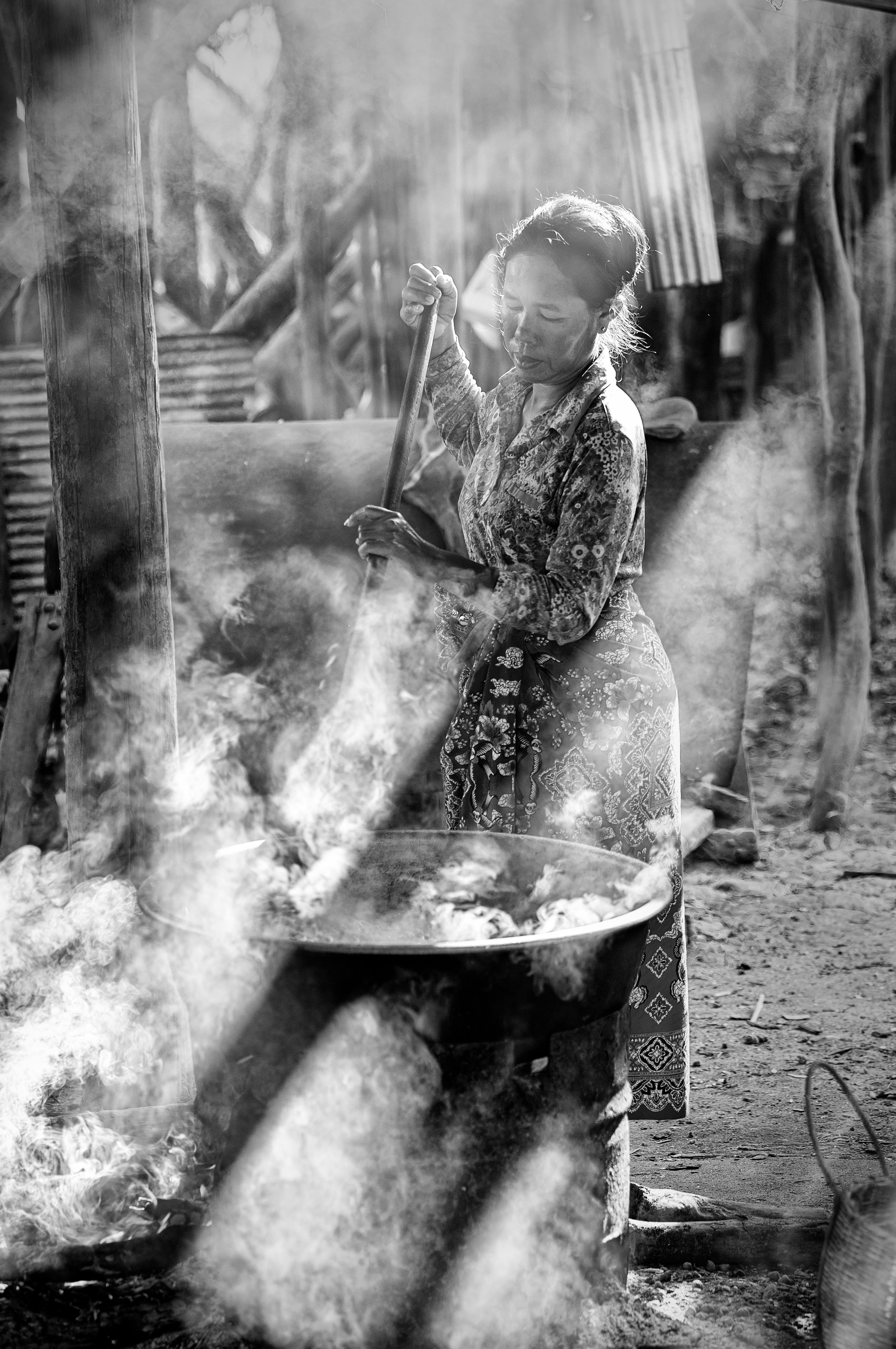 A woman stirring a large pot over an open fire in an outdoor setting, black and white.