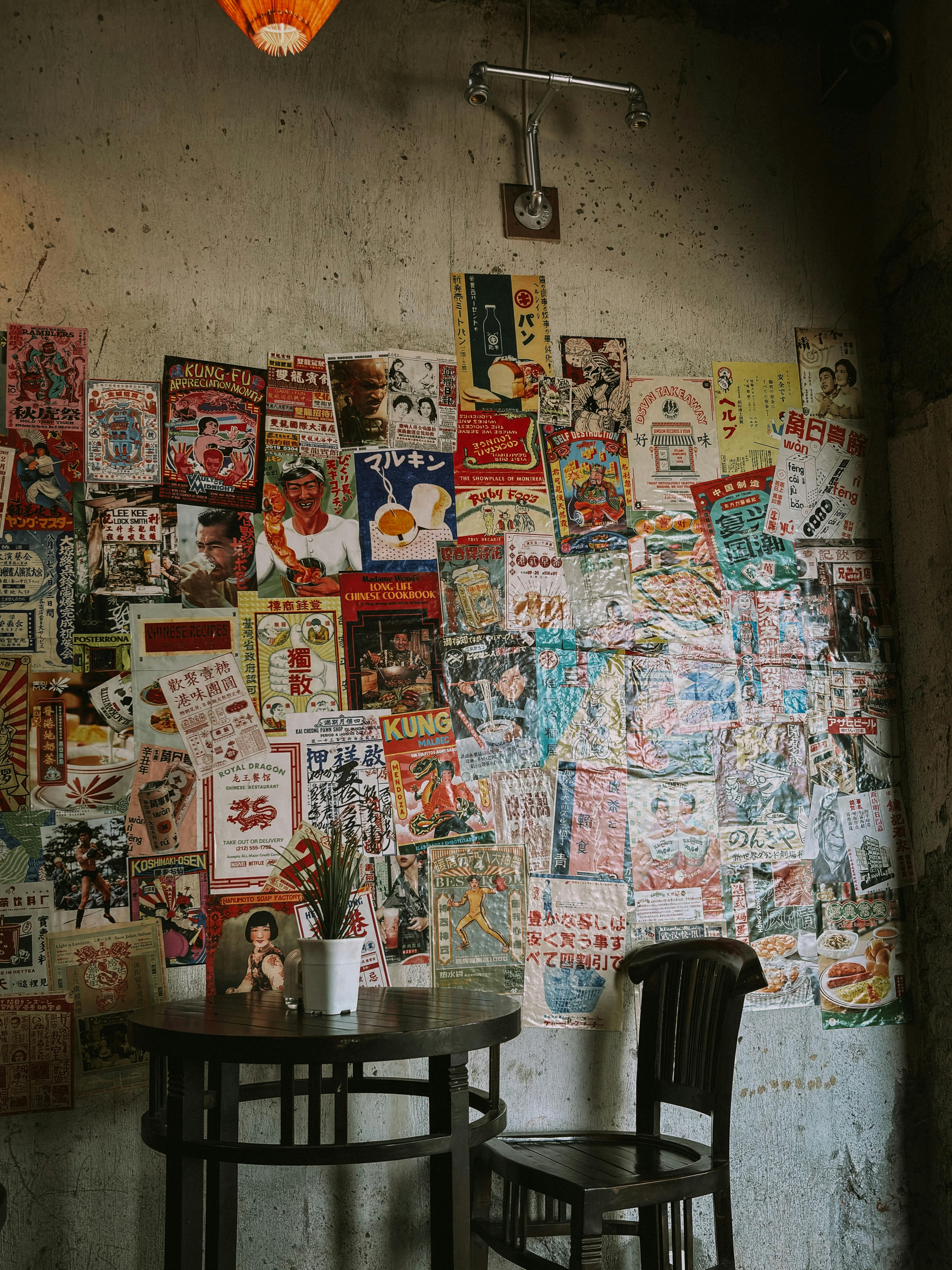 A cozy corner in an Indonesian cafe adorned with vintage Asian posters, offering nostalgic ambiance.