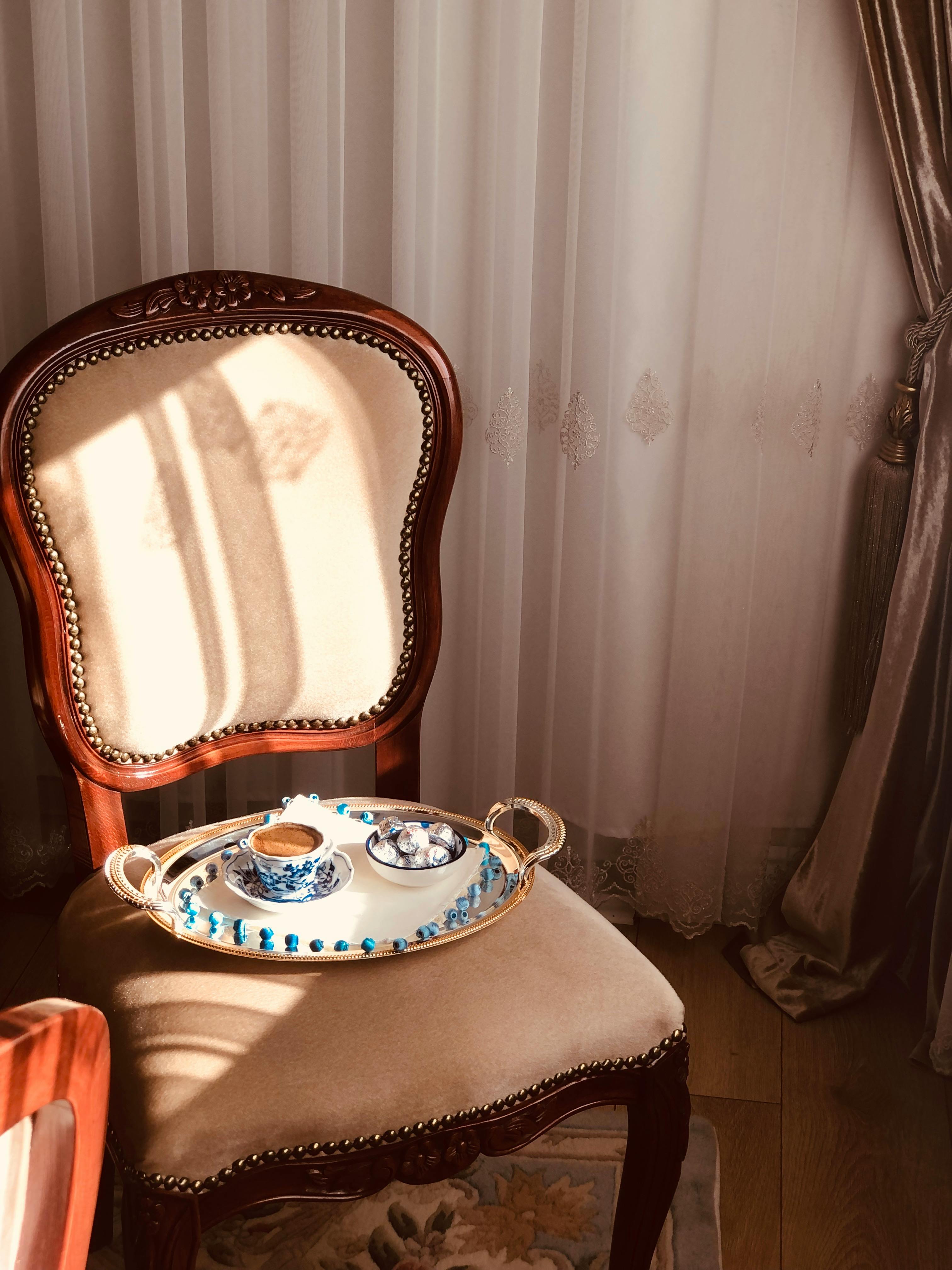 Antique chair with coffee and sweets in warm sunlight, elegant setting.