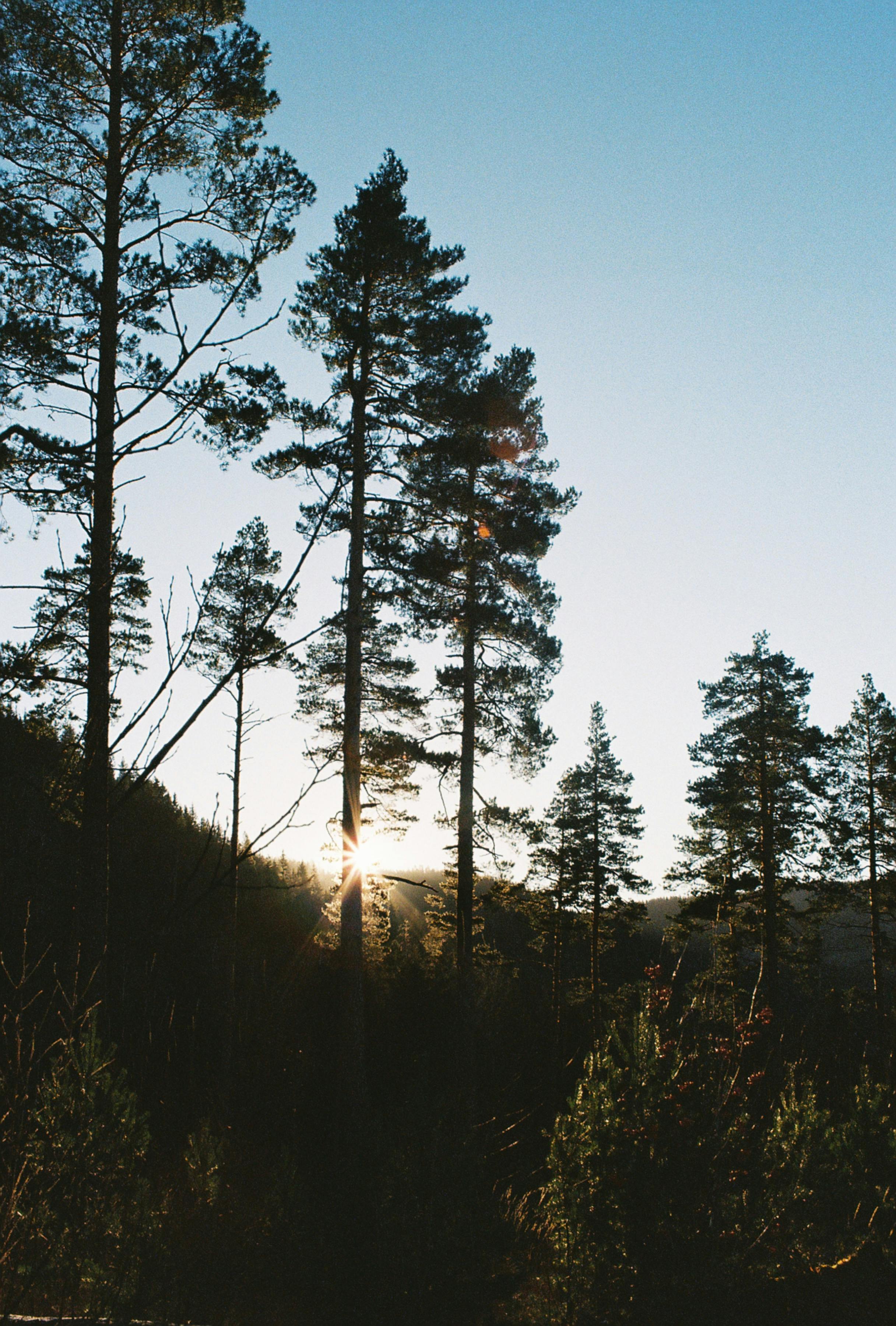Captivating sunset through trees in a tranquil Norwegian winter forest.
