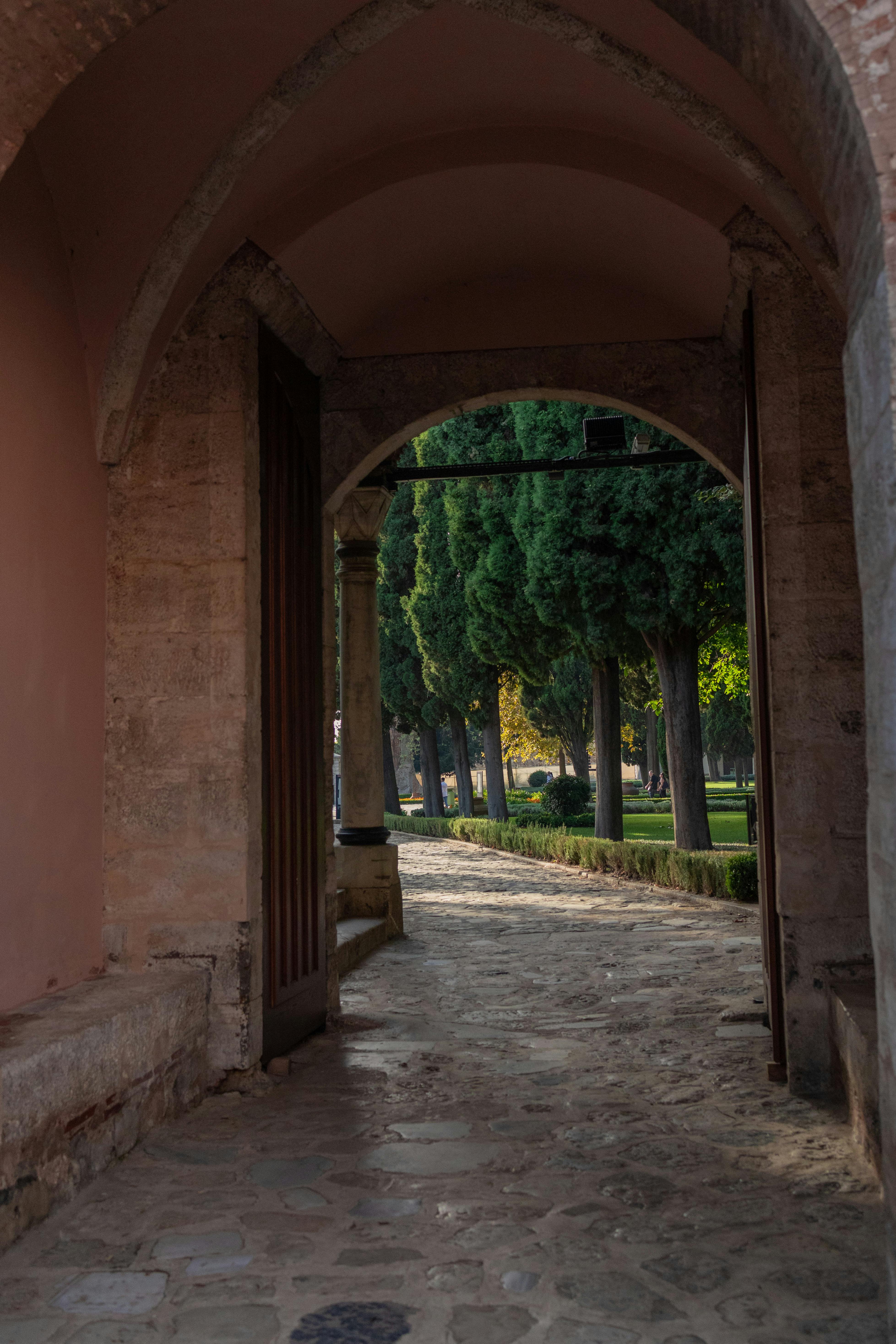 Beautiful stone archway leading to a lush park in Istanbul, Turkey.