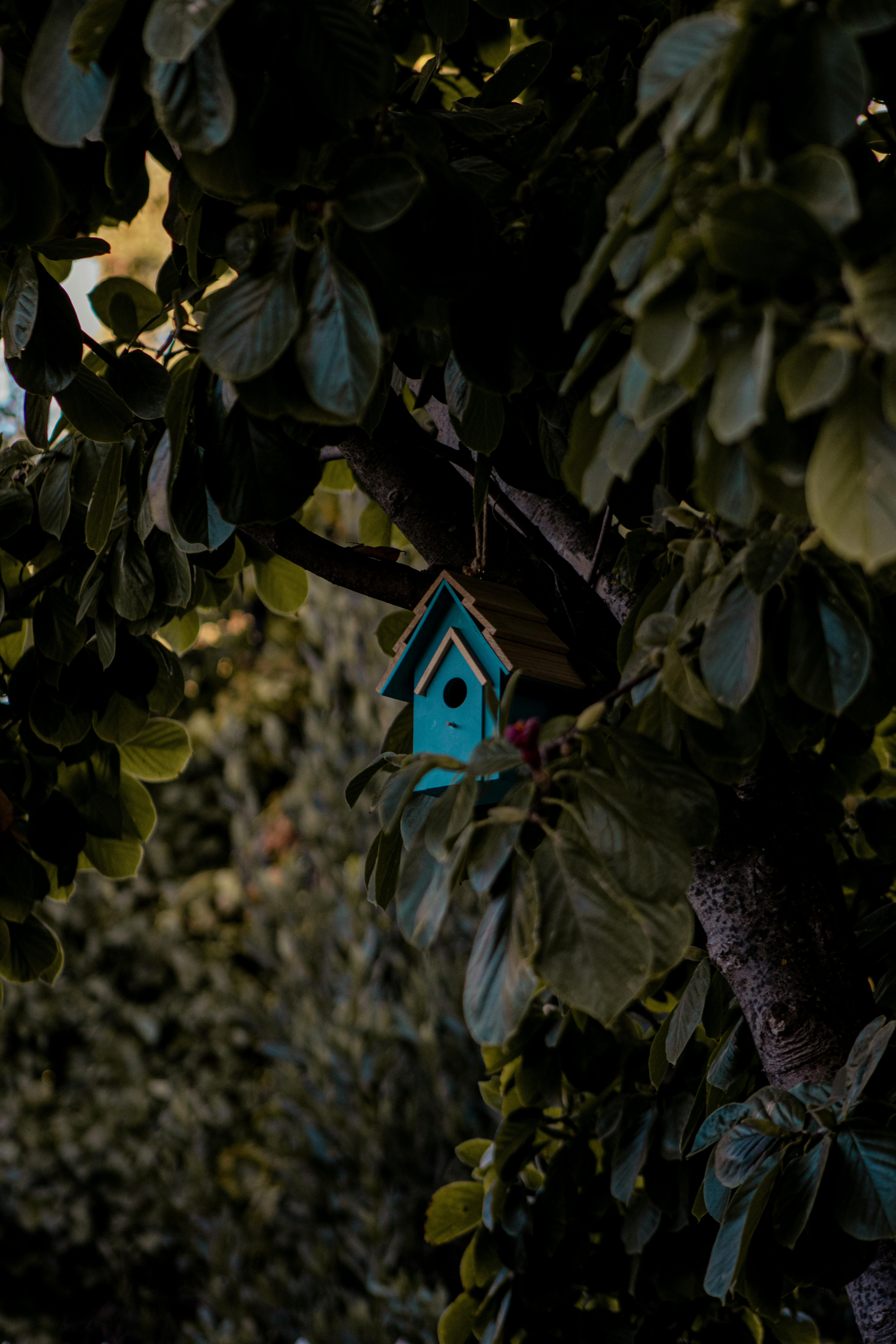 A charming blue birdhouse hangs amid lush green leaves in a serene Chilean park.