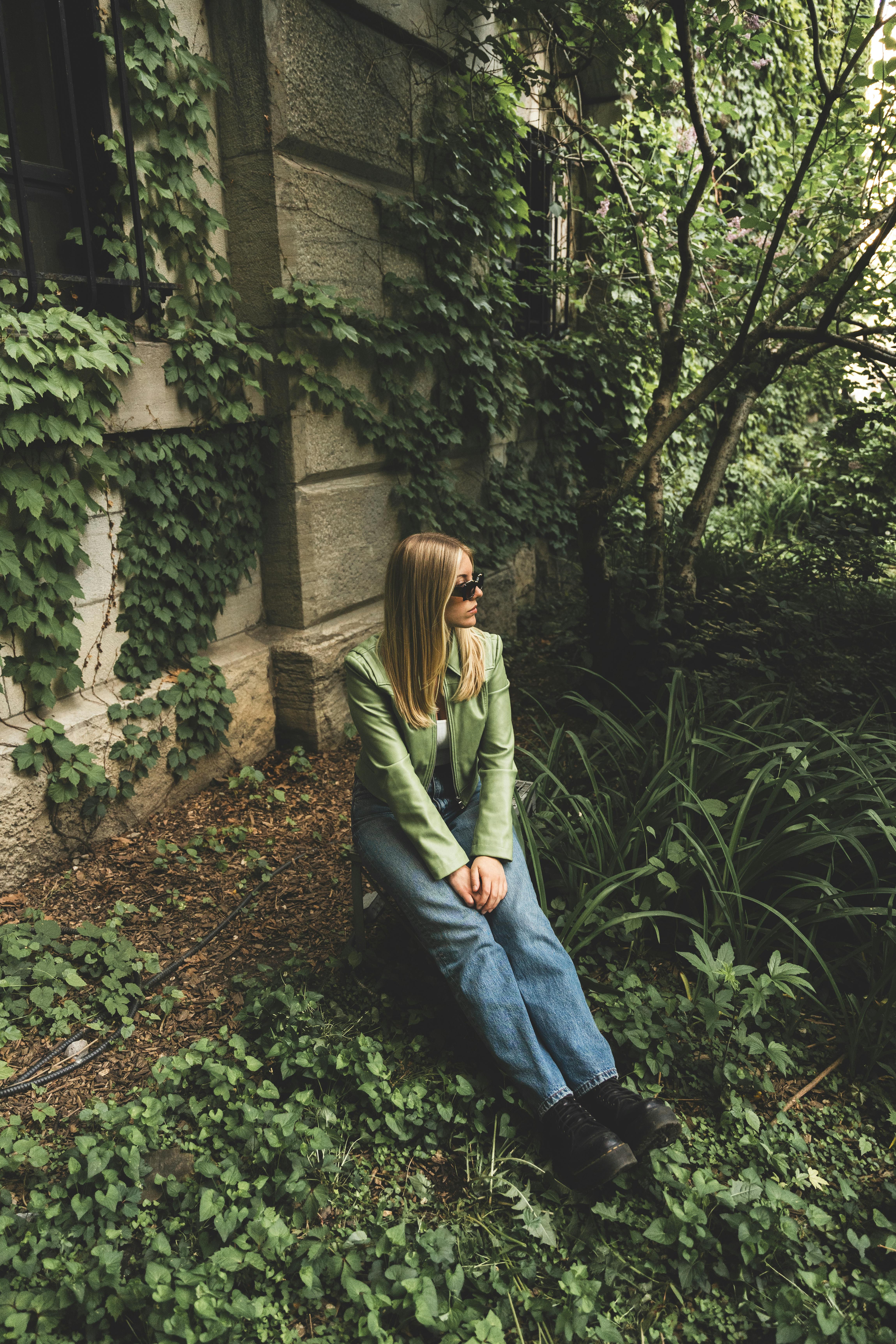 Woman in a green jacket sitting amidst lush greenery in a Montréal garden.