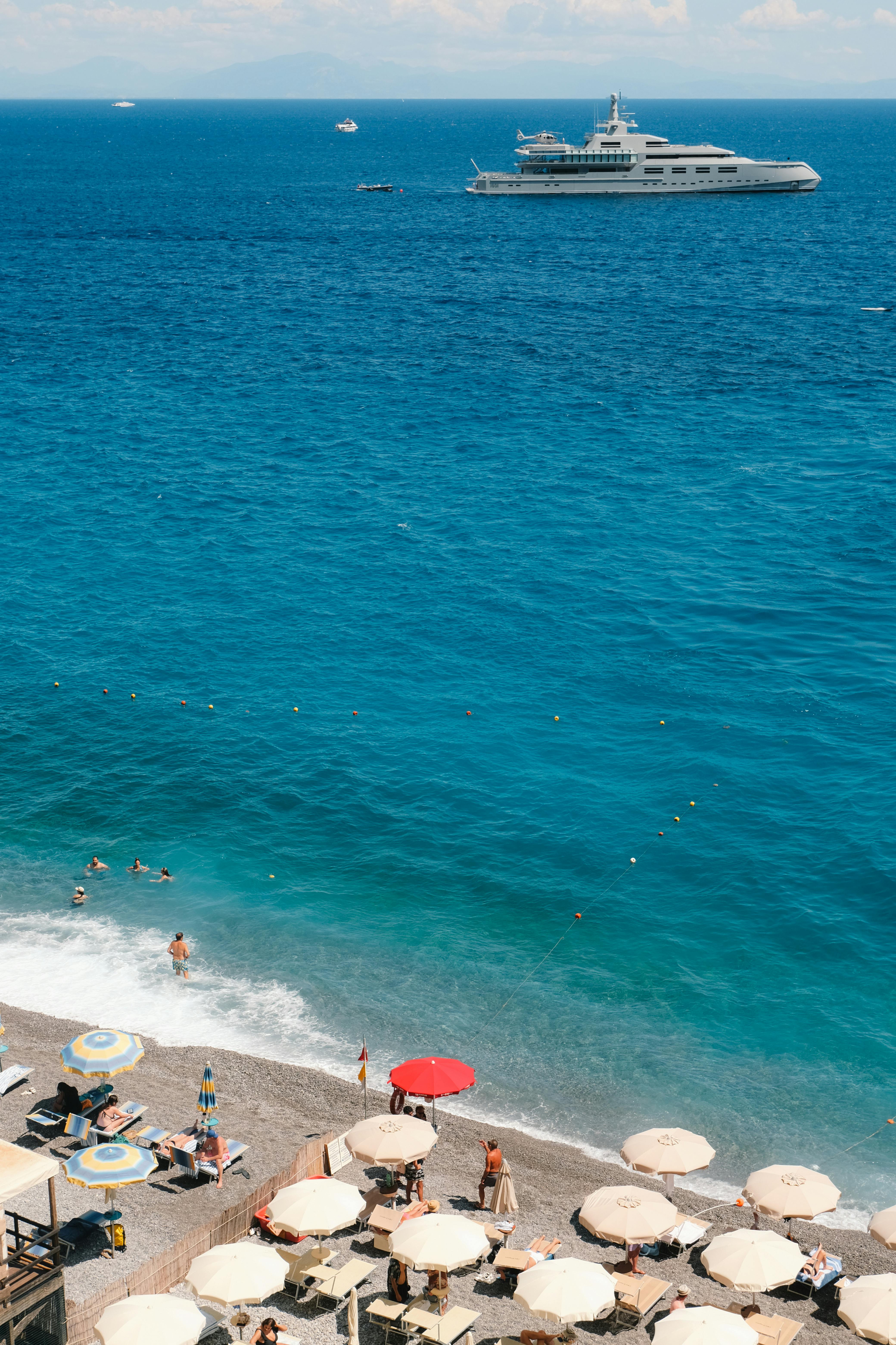 Relaxing summer beach scene on the Amalfi Coast with a luxury yacht.
