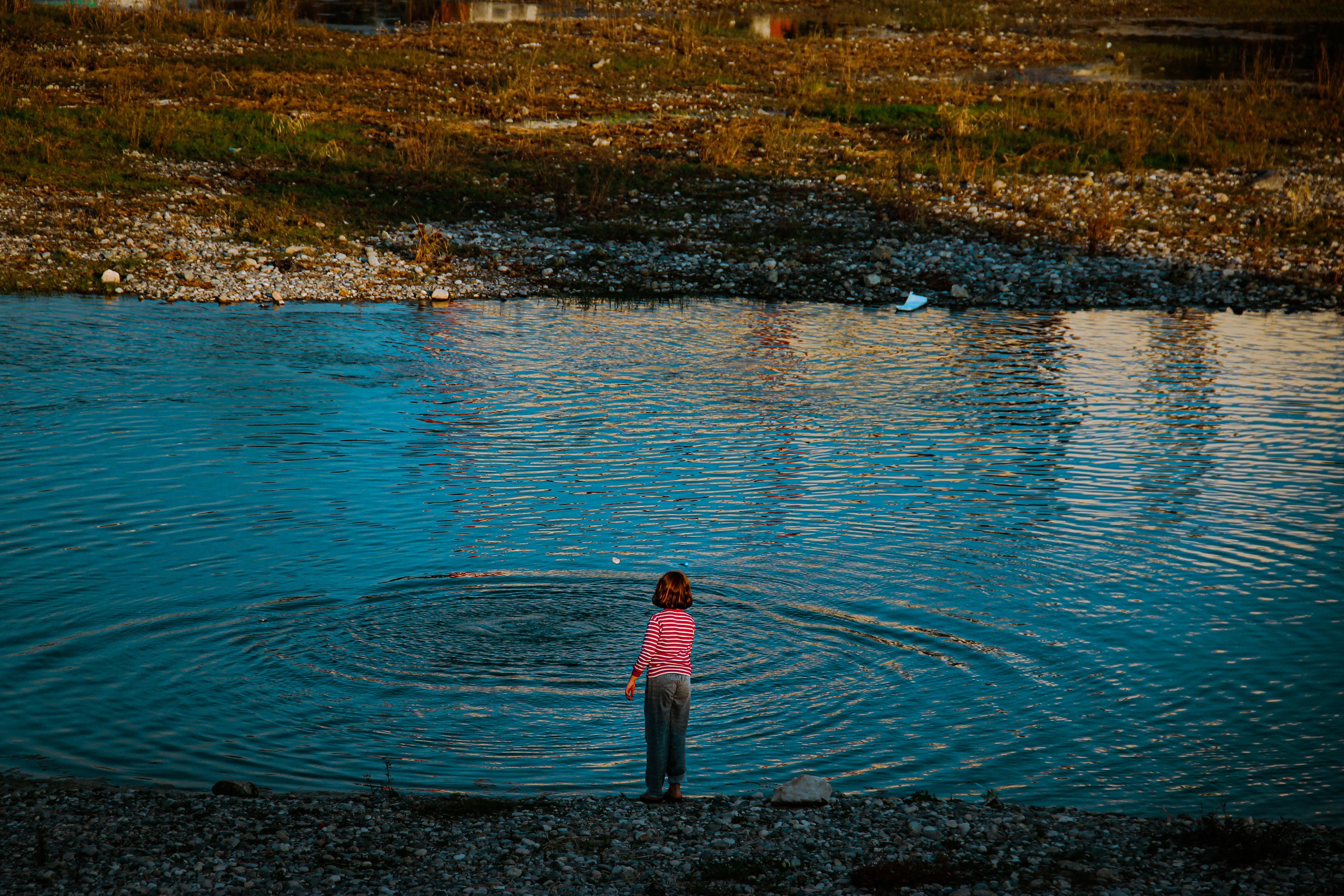 A young child in a striped shirt plays by the lakeside, rippling the calm water under a clear sky.