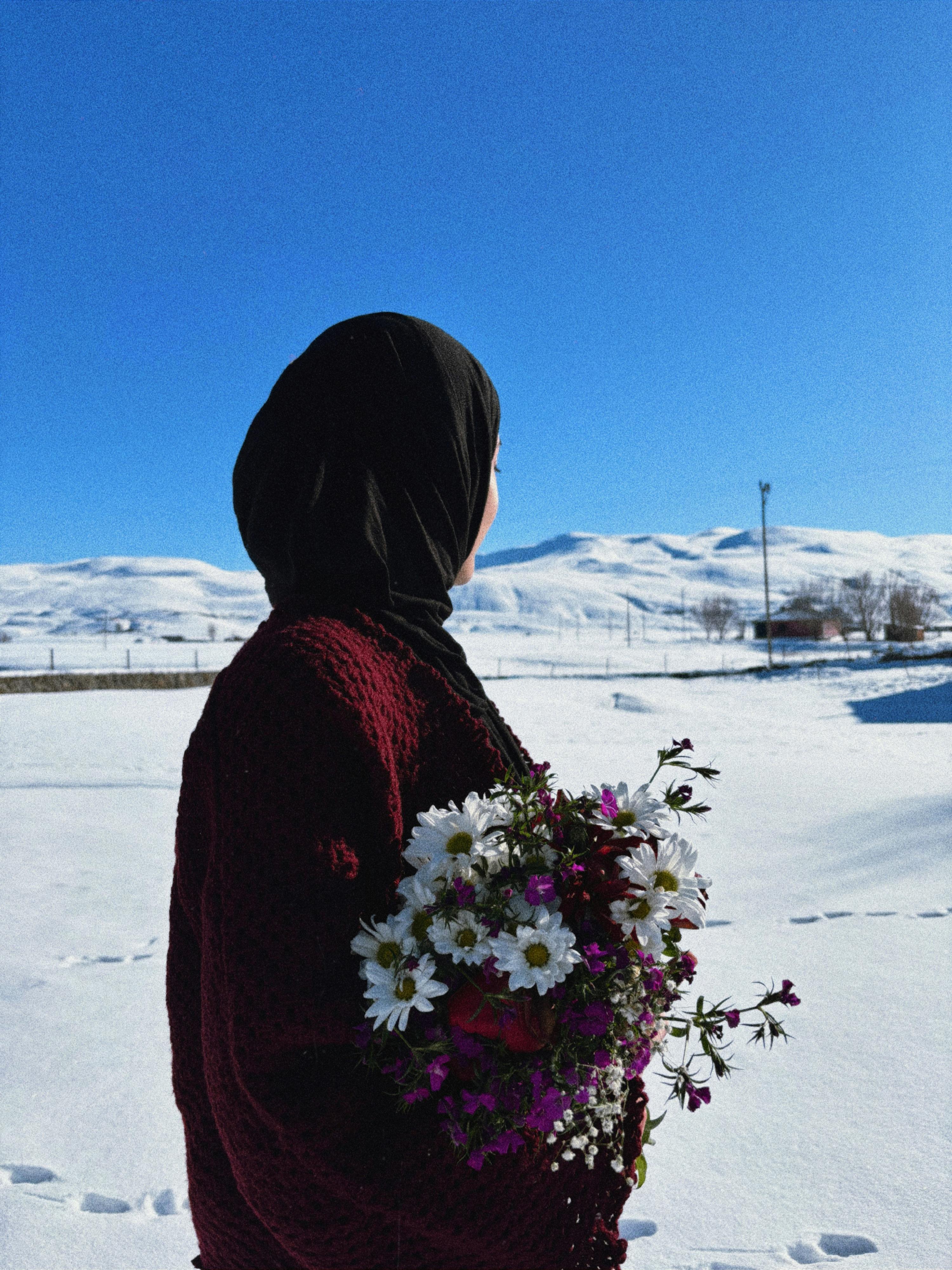 A woman in a hijab holds flowers against a snowy winter landscape under a clear blue sky.