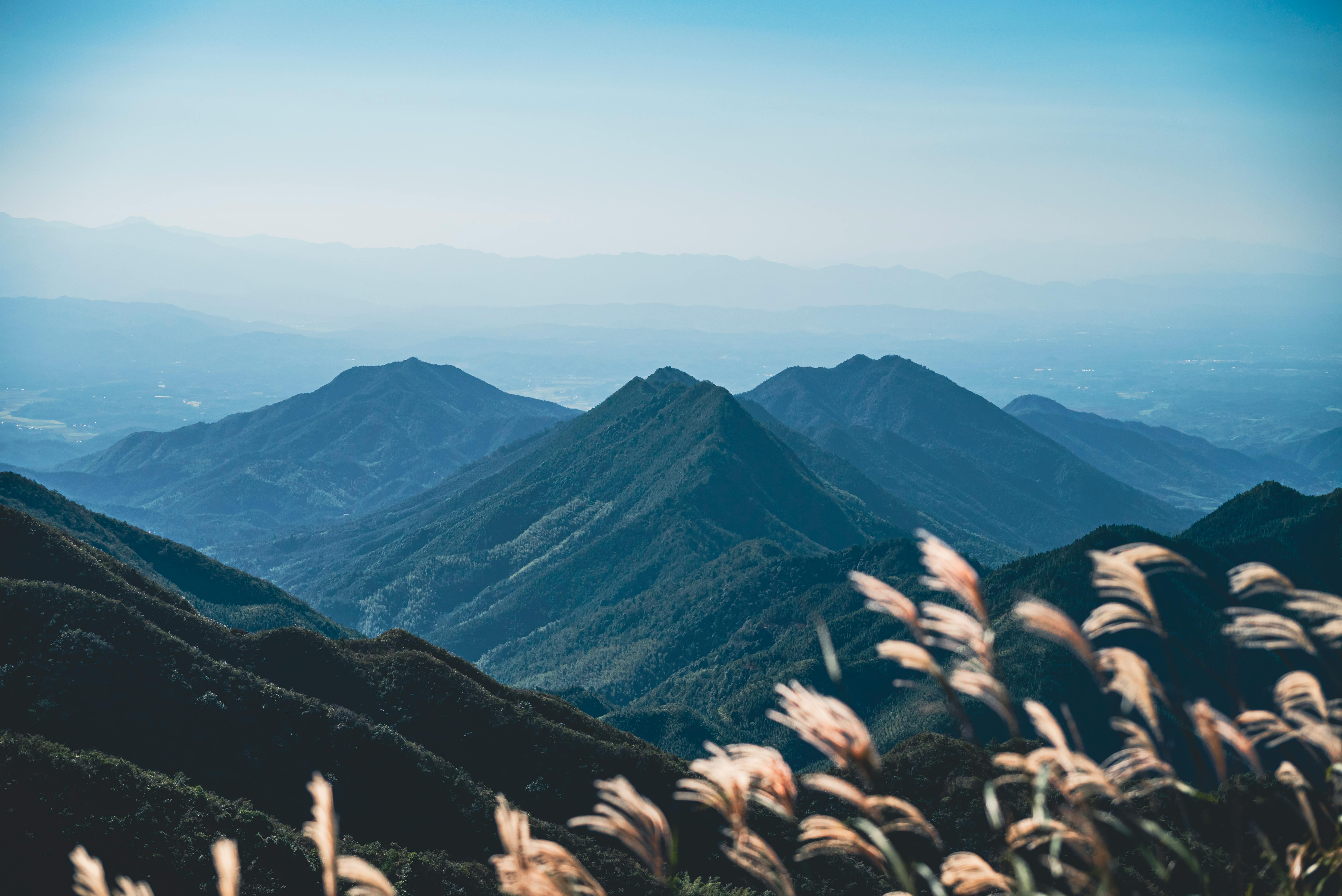 Beautiful mountain range with grasses in the foreground, under a clear blue sky.