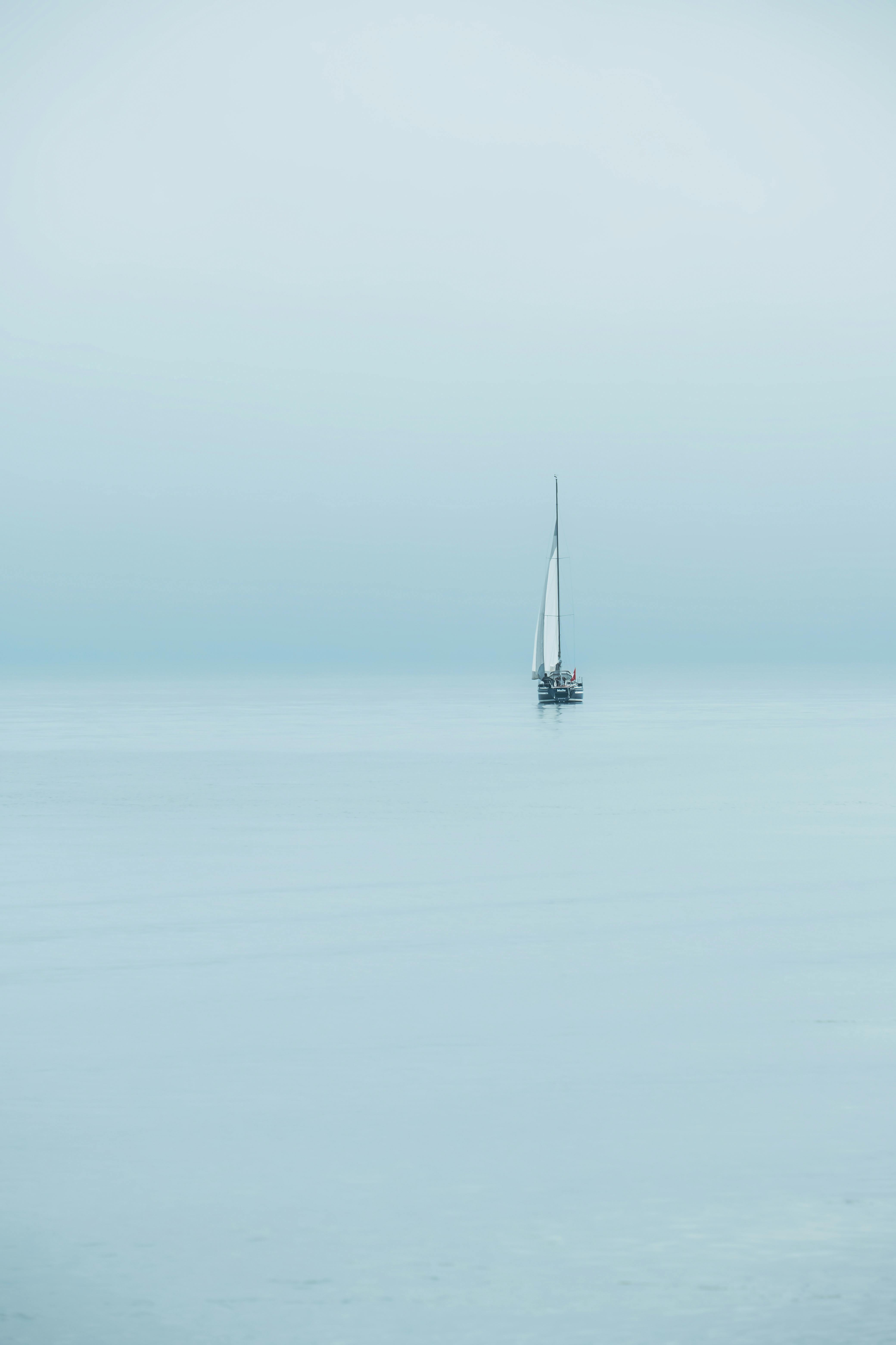 A serene scene of a lone sailboat on the calm waters of Lake Constance, enveloped in mist.